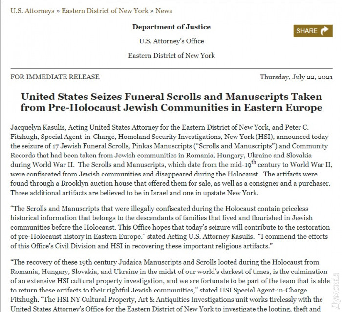 США вернут в Украину и ряд других стран еврейские артефакты, украденные во время Второй мировой войныВ США изъяли ряд еврейских религиозных артефактов, которые были похищены нацистами во время Второй мировой войны. Их планируют вернуть еврейским общинам в Украине, Румынии, Венгрии и Словакии. Об этом сообщила пресс-служба американского минюста. Отмечается, что на аукцион в Нью-Йорке выставили на продажу религиозные свитки, общинные рукописи и записи, принадлежавшие евреям, которые до Холокоста проживали в Румынии, Венгрии, Украине и Словакии. Всего на продажу выставлен 21 артефакт. Правоохранители изъяли их. Считается, что еще три артефакта находятся в Израиле и один — в северной части штата Нью-Йорк. «Свитки и рукописи, которые были незаконно конфискованы во время Холокоста, содержат бесценную историческую информацию, принадлежащую потомкам семей, которые жили и процветали в еврейских общинах до Холокоста. В этом управлении надеются, что изъятие ценностей будет способствовать восстановлению справедливости», — цитируют в минюсте США исполняющего обязанности прокурора США Касулиса. Установлено, что во время Второй мировой войны владельцев этих предметов поместили в гетто, а затем депортировали в концентрационные лагеря, где большинство из них было убито. После окончания войны выжившие вернулись и обнаружили, что их дома разграблены, а здания опустели. Среди украденных предметов были свитки и рукописи, содержащие информацию, касающуюся еврейских общин с 1840 года и вплоть до Холокоста. Правоохранители утверждают, что нет никаких законных оснований, чтобы эти артефакты могли оказаться в США. Поэтому их решили вернуть в страны происхождения. СМЕРТЬ РОСІЙСЬКИМ ОКУПАНТАМ! Помітили помилку? Виділяйте слова з помилкою та натискайте control-enter |