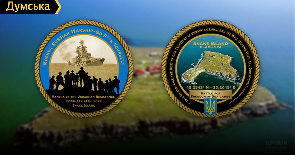 В описании пересказывается история захвата рф Змеиного, боев за него, а также приводится знаменитая фраза одного из защитников острова о направлении движения русского военного корабля. Присутствует она и на аверсе монеты.