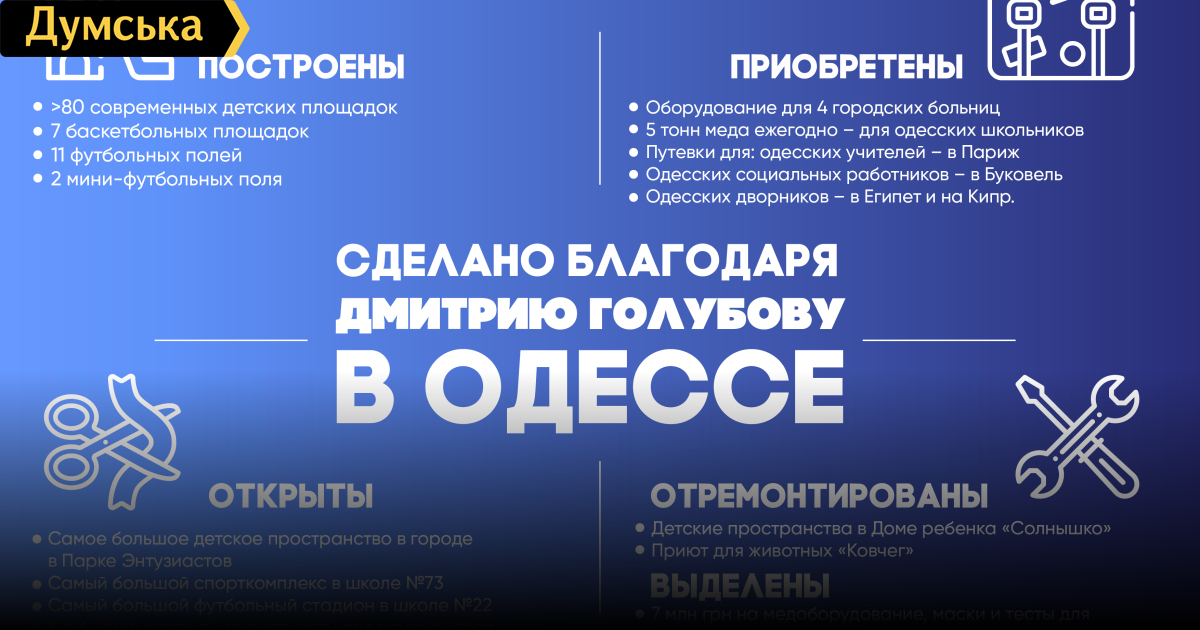 Стадионы, дворы и ремонты больниц: Дмитрий Голубов рассказал о проделанной работе (политика)Народный депутат VIII созыва Дмитрий Голубов подвел итоги своей работы и рассказал, что удалось изменить в Одессе за последние несколько лет благодаря его команде. Так, по словам Голубова, за время его каденции практически в каждом дворе Суворовского района появились новые детские площадки. «За эти годы удалось немало сделать. И особенно приятно, что получилось создать современные пространства для детей. Потому что от условий, в которых растут маленькие одесситы, от их детских впечатлений во многом зависит наше общее будущее, — отмечате Дмитрий Голубов. — Так, мы открыли в городе более 80 детских площадок, построили с нуля 11 футбольных и 2 мини-футбольных поля, а также 7 баскетбольных площадок. Помогали Дому ребенка «Солнышко» — создали здесь современный комплекс помещений для детских групп и инклюзивное пространство для детей с инвалидностью. А еще каждый год дарим одесским школьникам 5 тонн меда. Ведь дети, которые его едят, меньше подвержены простудам и лучше развиваются». Среди результатов работы политика — ремонт поликлиники №7 и приемного отделения городской инфекционной больницы. Этой весной вместе с группой депутатов Голубов выделил 7 млн гривен на медоборудование, маски и тесты для одесских больниц. Кроме того Голубов помог восстановить приют для животных «Ковчег» после пожара и создал бесплатную компьютерную школу для пожилых одесситов. Отметим, Дмитрий Голубов известен и благодаря своей поддержке работников государственного сектора – в частности, он регулярно отправляет отдыхать на курорты одесских дворников (в Египет и на Кипр), соцработников (в Буковель) и учителей (в Париж). СМЕРТЬ РОСІЙСЬКИМ ОКУПАНТАМ! Помітили помилку? Виділяйте слова з помилкою та натискайте control-enter