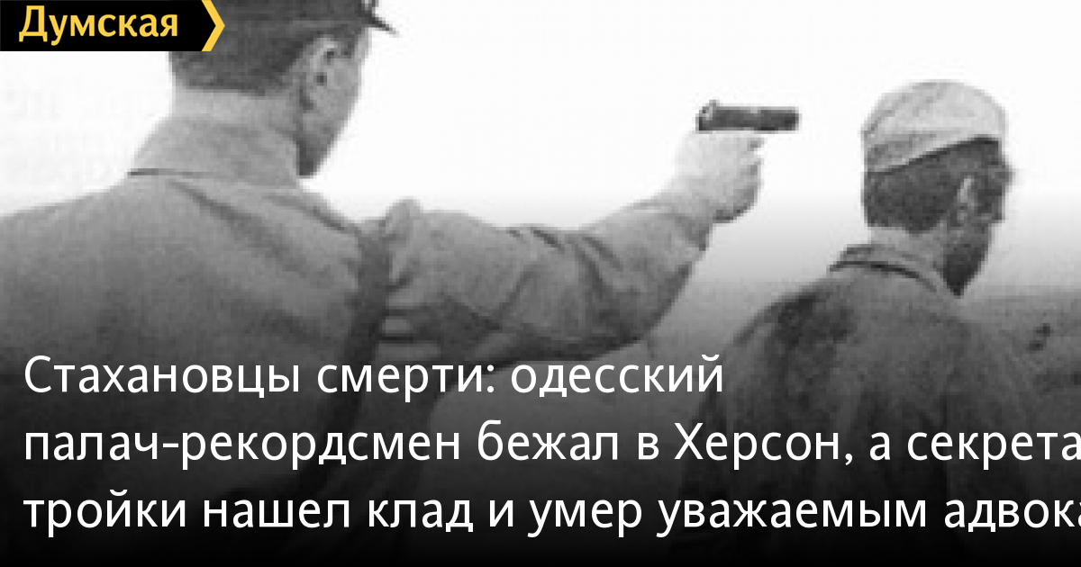 Стахановцы смерти: одесский палач-рекордсмен бежал в Херсон, а секретарь тройки нашел клад и умер уважаемым адвокатом«Думская» продолжает цикл «Красные палачи Одессы», посвященный преступлениям коммунистического режима, которые были совершены на территории нашего города и области. Сегодня мы расскажем о двух персонажах, которые принимали самое непосредственное участие в кровавых событиях 1937-1938 годов. Один из них ставил свою подпись под расстрельными списками, другой лично нажимал на курок, ежесуточно отправляя на тот свет десятки людей. Оба умерли в своих постелях, окруженные любящими детьми и внуками… «…А С БУМАЖКОЙ – ЧЕЛОВЕК» Как мы уже отмечали, советская система отличалась излишней страстью к обилию документов. Любое движение внутри гигантского государственного механизма обязательно должно было сопровождаться надлежащей бумажкой с подписью и печатью. И в самом деле, а вдруг ревизоры спросят, на что товарищем таким-то и тогда-то потрачена сотня револьверных патронов, пять пачек щелока, три тряпки половые, мыло хозяйственное один кусок, одеколон «Тройной» одна мензурка, литр спирта питьевого и три талона на усиленное питание по норме летного состава ВВС, не говоря уже об ежемесячной премии исполнителю в размере 95 рублей? Именно столько ресурсов уходило в среднем на одну массовую казнь, которые совершались в Одессе обычно раз в два-три дня. Кому из репрессированных жить (в лагере), а кому упасть с простреленным затылком, решали в то время два органа. Всесоюзная «двойка» санкционировала убийства по самым важным, обычно «шпионским» делам. В Одессе наиболее масштабными были «польское», «немецкое» и «румынское» дела, в рамках которых людей пачками стреляли якобы за сотрудничество с соответствующими разведками. В основном убивали представителей нацменьшинств, но под раздачу попали и «титульные» русские и украинцы. «Двойка» состояла из наркома внутренних дел Ежова и прокурора СССР Вышинского. Остальными категориями задержанных занималась областная «тройка» — начальник УНКВД, секретарь обкома и областной прокурор. Решения оформлялись протоколами, причем не отдельно по каждому человеку, а скопом по всем. Выглядит это как таблица, где слева фамилия, имя и отчество несчастного, наименование подразделения, состряпавшего дело, и краткое изложение «вины» (бывший эсер, проник в колхоз, занимался вредительской прополкой кукурузы, рассказывал лживые анекдоты про Хозяина и так далее). А справа, за чертой – лаконичное «РАССТРЕЛЯТЬ». Никакой мотивировки, даже ссылок на статьи УК нет.