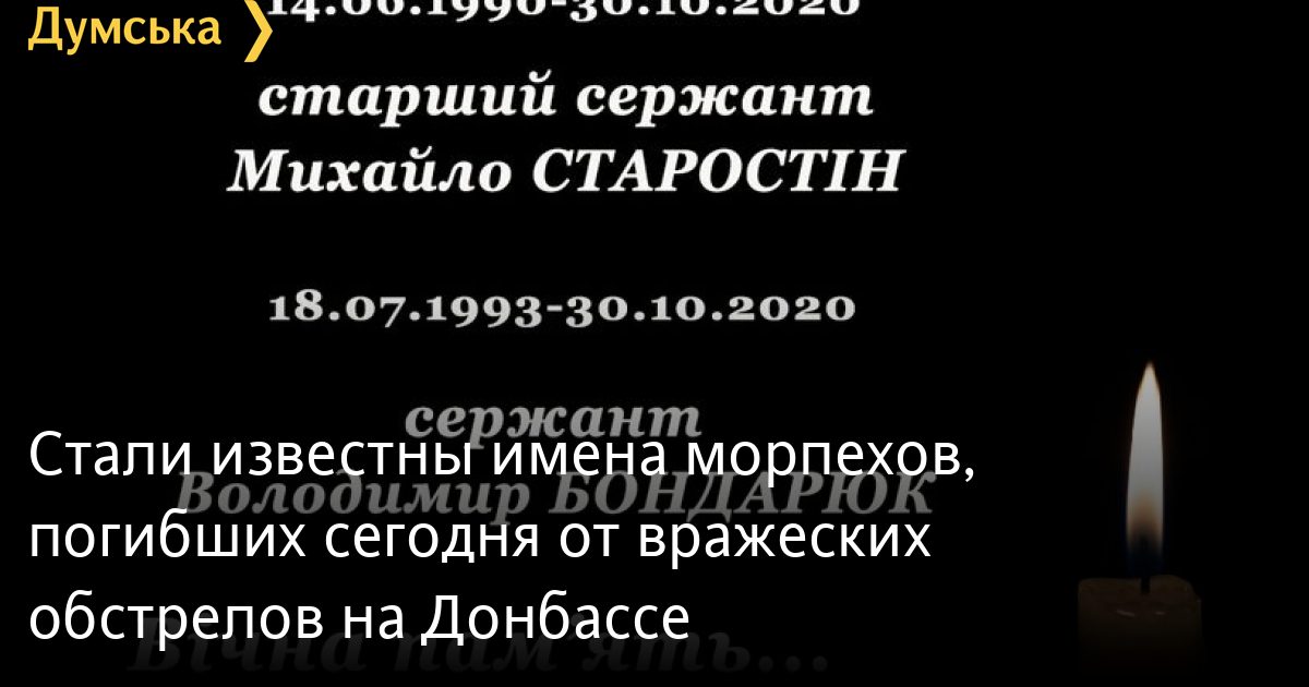 Стали известны имена морпехов, погибших сегодня от вражеских обстрелов на ДонбассеСтали известны имена погибших сегодня украинских воинов в результате вражеского обстрела возле села Водяное неподалеку Мариуполя. Как сообщает командование Морской пехоты Украины, это бойцы 36-й отдельной бригады морской пехоты имени контр-адмирала Михаила Билинского — старший сержант Михаил Старостин и сержант Владимир Бондарюк. Владимиру Бондарюку летом исполнилось 27 лет, а Михаилу Старостину было 30 лет, он с Херсонщины — поселка Новорайск в Бериславском районе. Завтра в полдень там попрощаются с погибшим героем. Напоминаем, что сегодня около полуночи российские оккупанты открыли прицельный огонь по позициям украинских военных, на что подразделения Объединенных сил ответили огнем. Командование морской пехоты и весь личный состав выражает искренние соболезнования семье и близким погибших героев и разделяет невыразимую боль тяжелой утраты. Вечная память и слава павшим защитникам Украины. СМЕРТЬ РОССИЙСКИМ ОККУПАНТАМ! Заметили ошибку? Выделяйте слова с ошибкой и нажимайте control-enter |