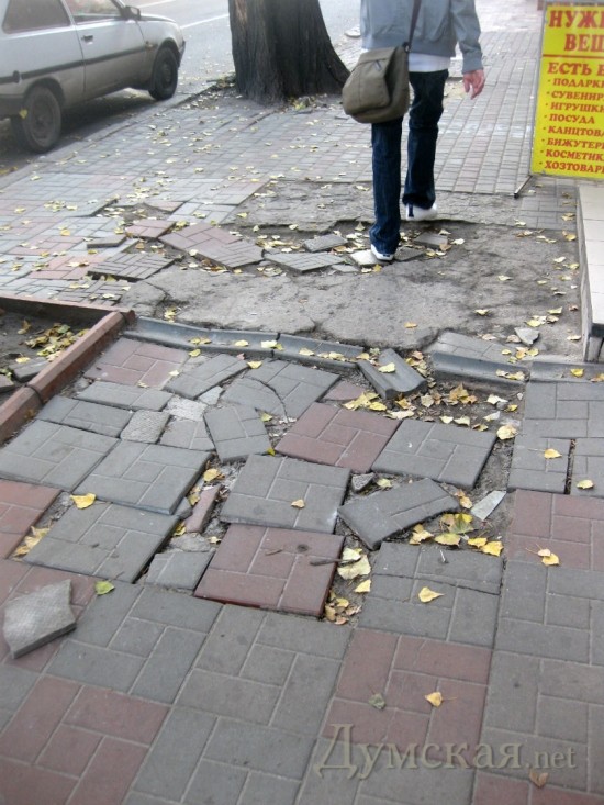 Пользователь «Думской» BARS_777, прогулявшись по центру Одессы, заметил, что занятие это чем-то напоминает приключения героев известного фантастического романа братьев Стругацких «Пикник на обочине», ну, или компьютерной игры «S.T.A.L.K.E.R.». Здесь, как и в вымышленном писателями мире, человек сталкивается с коварной и изменчивой местностью. Свои впечатления от путешествия он изложил в эссе, которое мы и представляем вниманию читателей. Итак, попробуем разобраться, чем же так опасны прогулки по некогда уютным, известным, и, казалось бы, безопасным улицам города. В качестве отправной точки нашего путешествия возьмем, к примеру, Куликово поле, а финишируем на Троицкой улице. Сразу при выходе из трамвая №18 бывший пассажир, расслабившийся от комфортного передвижения вышеназванным маршрутом, рискует почти по колено быть поглощенным вечной лужей, которая обосновалась внутри трамвайного круга. О ней, пожалуй, стоит рассказать отдельно. Этот водоем представляет собой аморфный объект, активно меняющий свои границы в зависимости от времени года и количества осадков; в свои лучшие времена достигает не менее шести метров в диаметре и глубины почти 30 см; не всегда пересыхает даже в летний зной; любезно предоставляет приют личинкам различных видов комаров. Однако продолжим наш путь в сторону Троицкой и обратим свой взор под ноги, где скрываются многочисленные, хотя пока и не самые страшные, опасности. Едва миновав тротуар у небезызвестного ночного клуба, у которого, нужно отдать должное, тротуар и прилегающая территория выглядят практически безукоризненно и достойны всяческих похвал, переходим (осторожно) Итальянский бульвар. Дальше нас ждет очередное испытание. Вступаем в узкий лабиринт, сформированный из остатков асфальта советских времен и припаркованных на тротуаре автомобилей. Если вам с детской коляской, тростью или на роликах удалось преодолеть и это препятствие, можете приписать себе определенную долю героизма, но расслабляться не стоит. Пробуем двигаться дальше. Враг не дремлет -впереди уже виднеется очередной «сюрприз». Коварство этого участка заключается в том, что вы ни за что не сможете почувствовать под ногами твердую землю. На каждом шаге вы рискуете если не споткнуться и заработать вывих или растяжение голеностопного сустава, то, как минимум, потеряете равновесие, поскольку здешняя почва ведет себя не надежнее топей гиблых болот из самой страшной сказки. Неужели и это сумели преодолеть? Ну, тогда квест посложнее – сыграем в сапера. Правила просты и известны всем по одноименной компьютерной игре — ходить только по безопасным квадратикам и не наступать на мины. Однако в реале все жестче. Наступив на тротуарную мину, прохожий моментально почувствует «взрыв», который будет выглядеть как вертикально направленный плевок песчано-грязевой смеси. Радиус поражения прямо зависит от вашего веса и скорости передвижения. Данная ловушка работает круглый год, но особенно эффективна летом для открытой обуви и светлой одежды. Вовремя заметили опасность и решили обойти? Что ж, вполне логично, но тут вас может поджидать распространенная комбинированная ловушка из канализационных люков, припаркованных автомобилей, банальных баррикад на тротуаре от ЖКХ, но и это осилим! Мы с вами почти у цели, скоро можно будет свернуть на Троицкую улиц