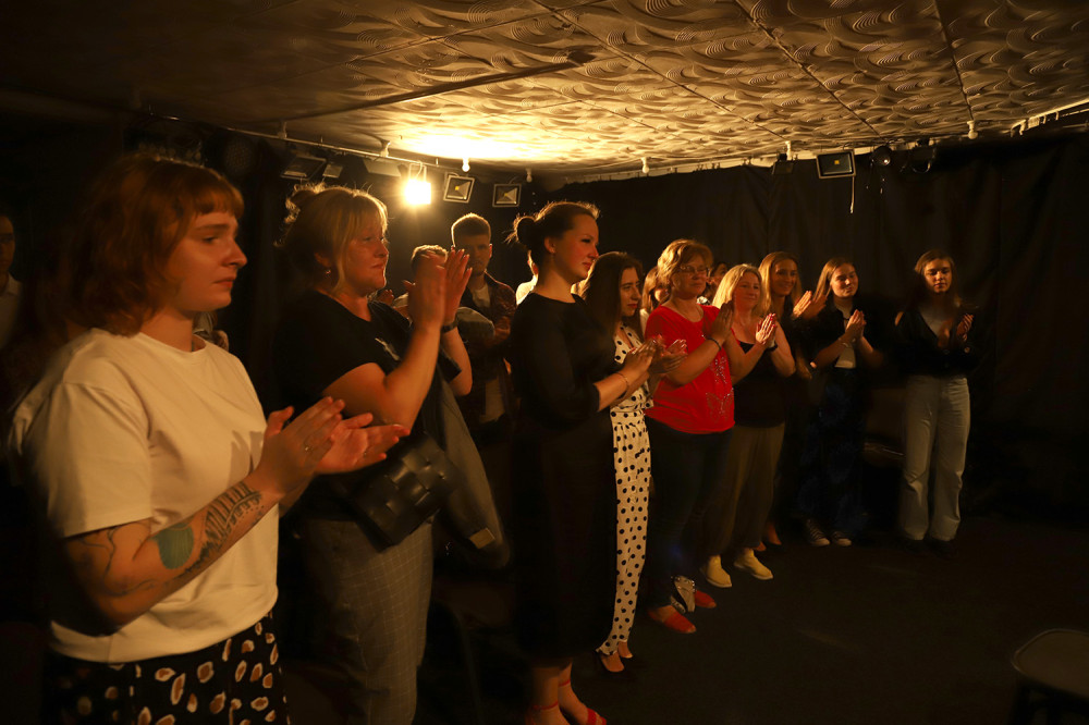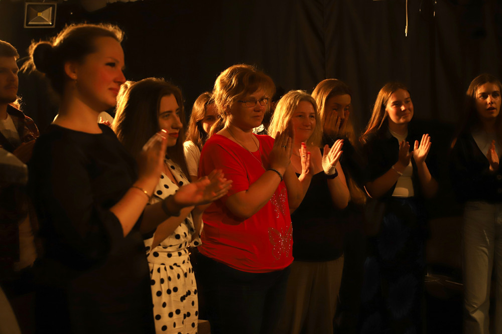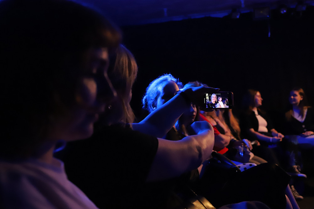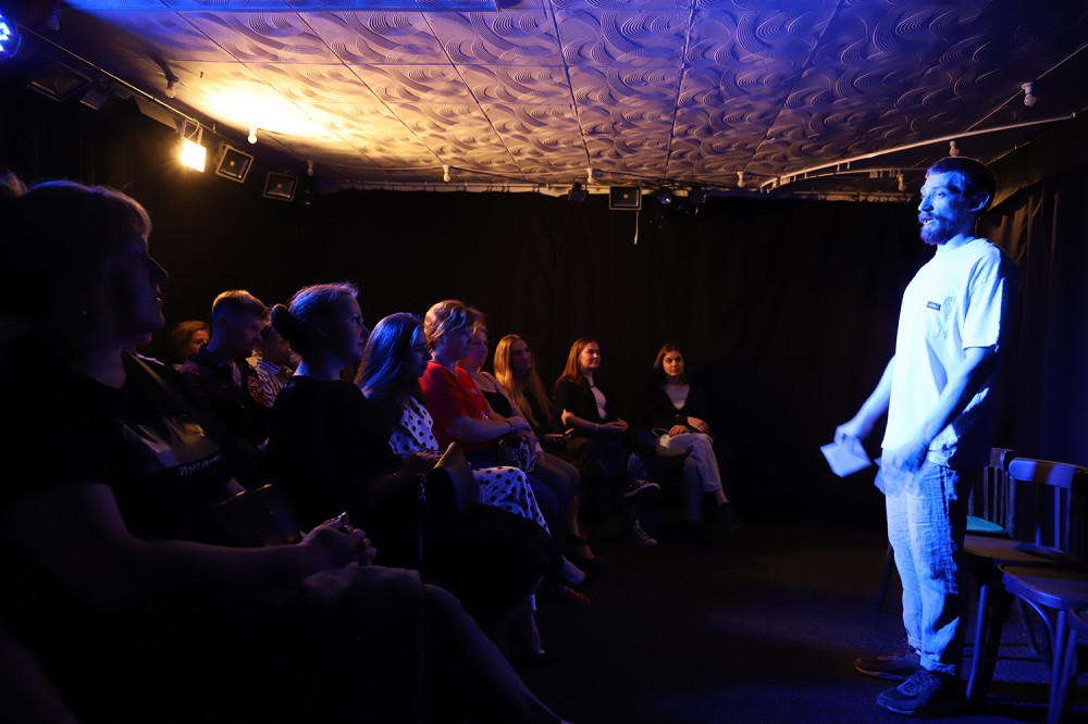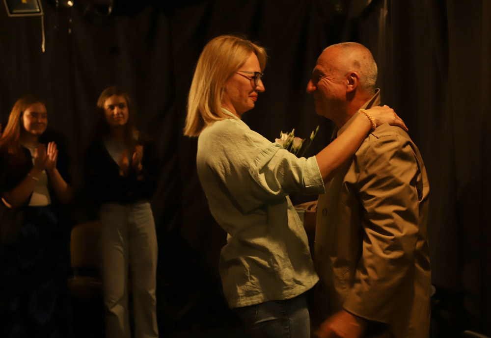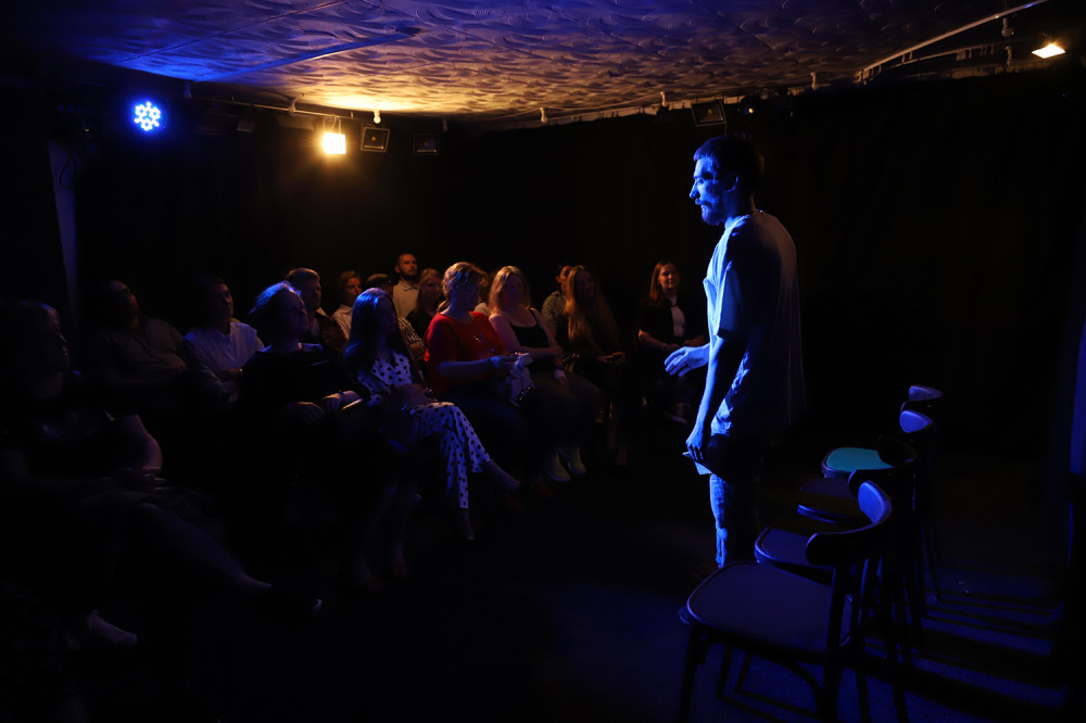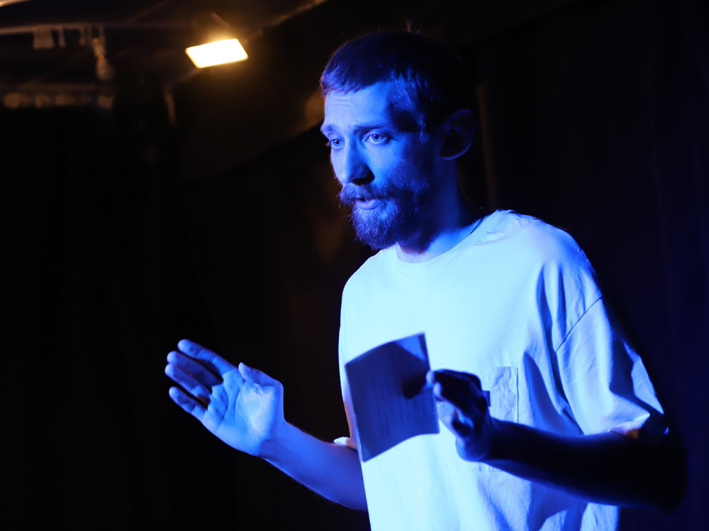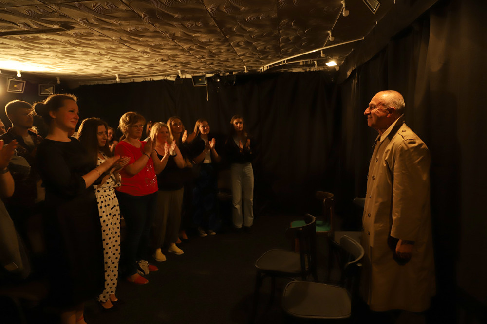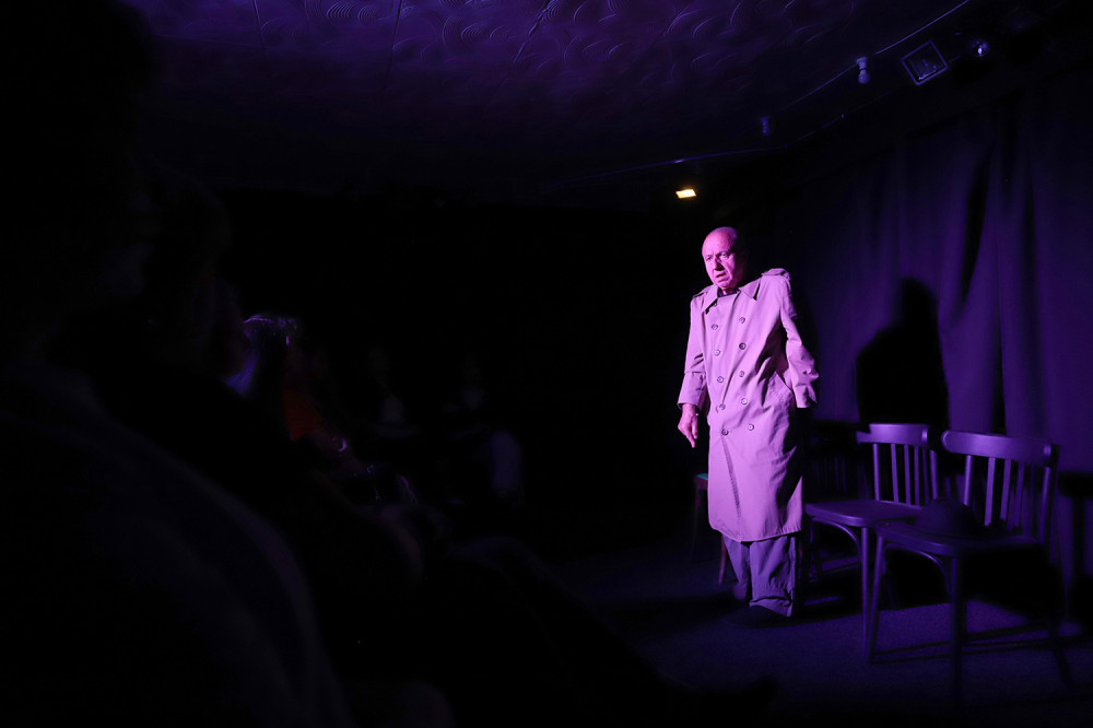 Перед спектаклем артист театра Даниил Савченко предупредил, что в случае воздушной тревоги все дружно бегут в бомбоубежище на Гоголя, 7, это в двух шагах. Забегая вперед, скажем, что эта мера не понадобилась, и моноспектакль заслуженного артиста Украины Юрия Невгамонного «Осiнь» по Тадеушу Ружевичу прошел на одном дыхании. Напомним, что XII Фестиваль театров «Молоко» в 2019 году включил этот спектакль в свою программу и наградил артиста за многолетний труд и весомый вклад в развитие театрального искусства. Спектакль исполняется на украинском и польском языках (перевод с польского осуществила Ярина Сенчишин, но и мелодику оригинала слушатель тоже оценит).
