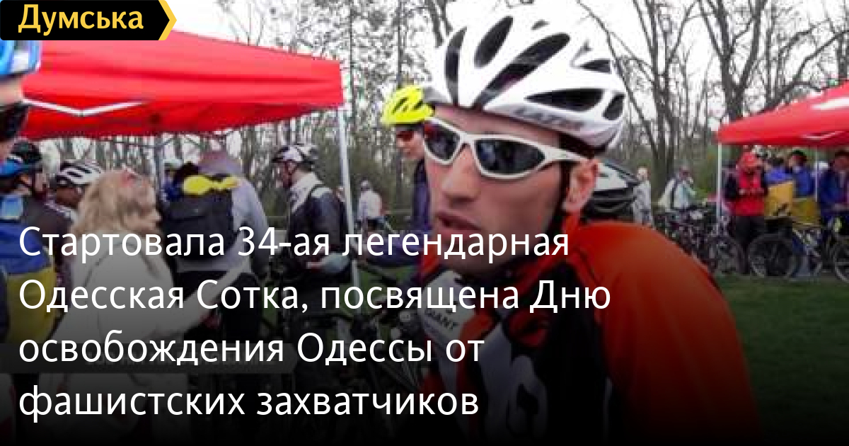 Стартовала 34-ая легендарная Одесская Сотка, посвящена Дню освобождения Одессы от фашистских захватчиков«Одесская сотка за 100 часов». Стартовал тридцать четвертый легендарный веломарафон, посвященный Дню освобождения Одессы. Маршрут проходил по южной части Пояса Славы, где расположены монументы, возведённые в 1964-1967 годах. Участие приняли свыше двух тысяч спортсменов со всей страны СМЕРТЬ РОССИЙСКИМ ОККУПАНТАМ! Заметили ошибку? Выделяйте слова с ошибкой и нажимайте control-enter Думская ТВ. Сюжеты: