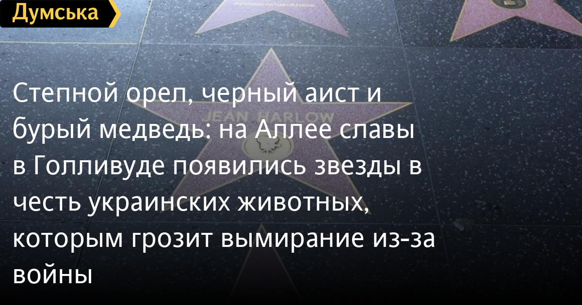 Степовий орел, чорний лелека і бурий ведмідь: на Алеї слави в Голлівуді з`явилися зірки на честь українських тварин, яким загрожує вимирання через війнуЗірки на честь тварин, яким через російсько-українську війну загрожує зникнення, з'явилися на Алеї слави в Голлівуді. Об'єкти тимчасово розмістили активісти UAnimals у рамках міжнародної кампанії #StopEcocideUkraine. Загалом через російське вторгнення на межі вимирання опинилися 80 видів тварин, що мешкають в Україні. Серед них - степовий орел, бурий ведмідь, євроазіатська рись, чорний лелека та крапчаста сипуха. Їхні назви сусідять з іменами зірок Тома Круза, Арнольда Шварценеггера, Френка Сінатри та інших. Зазначимо, що внаслідок російської агресії 20% природоохоронних територій України опинилися в зоні бойових дій, десять національних парків, вісім заповідників і два біосферні заповідники перебувають на окупованій території. СМЕРТЬ РОСІЙСЬКИМ ОКУПАНТАМ! Помітили помилку? Виділяйте слова з помилкою та натискайте control-enter |