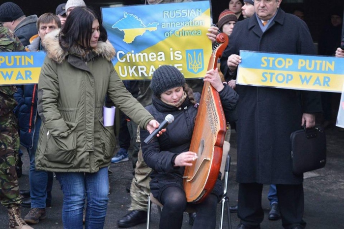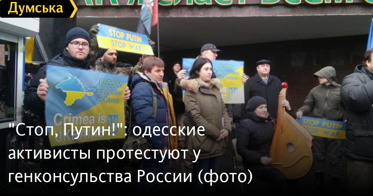 Активисты партий ДИЯ, организации «Автомайдан», «Самооборона» и других выступили с лозунгами «Стоп, Путин! Стоп война!», «Крым — это Украина». С собой активисты привезли звуковое оборудование, а также бандуристов. Как сообщает одесский «Автомайдан», цель акции — выступить против российской агрессии.