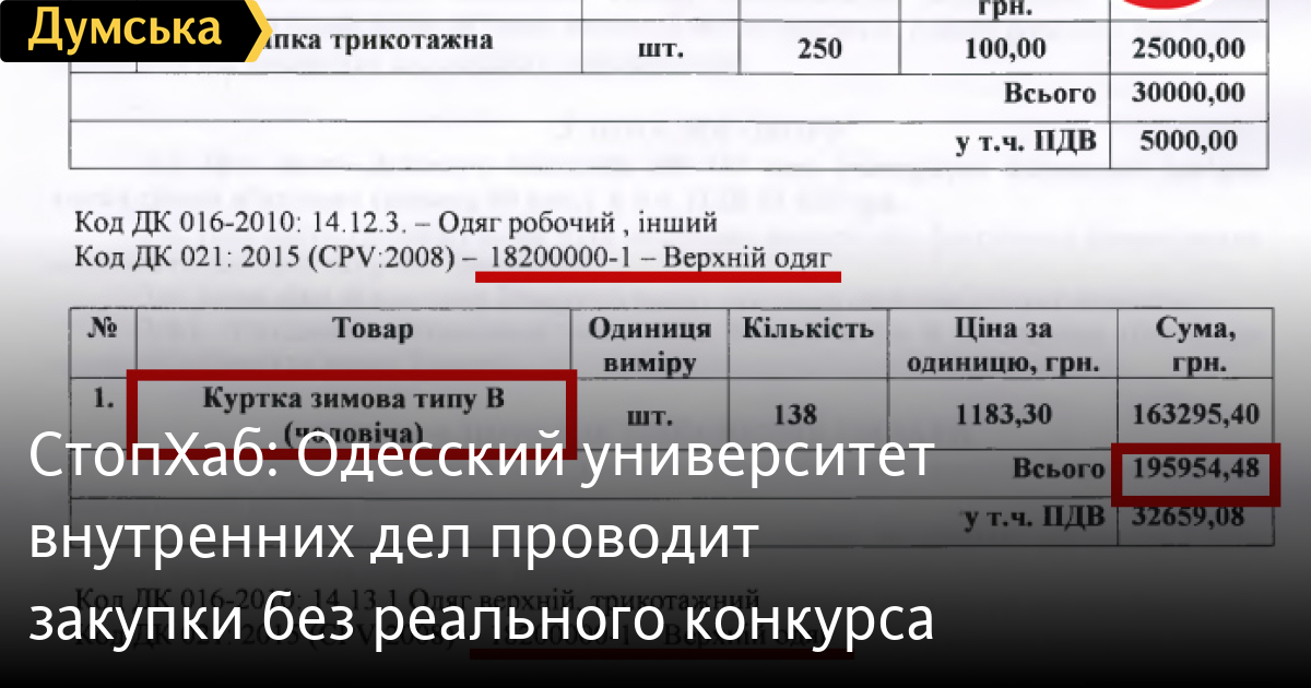 СтопХаб: Одесский университет внутренних дел проводит закупки без реального конкурсаОбщественное движение СтопХаб обратилось в Государственную аудиторскую службу и Национальную полицию Украины относительно тендерной политики Одесского государственного университета внутренних дел. Как отмечают борцы с коррупцией, руководство вуза избегает проведения открытых торгов в соответствии с законодательством о публичных закупках. За все время существования системы Prozorro университет провел более 100 процедур закупок и подписал договоров на сумму более 8 миллионов гривен, однако конкурентными из них были лишь единицы. «Этому есть интересное объяснение: в ряде случаев применена схема незаконного разделения предмета закупки на части во избежание проведения процедуры открытых торгов», — утверждают общественники. Так, в конце 2016 ОГУВД закупил мужские зимние куртки общей стоимостью 195 тыс. грн, и такие же женские куртки стоимостью 159 тыс. грн. Все они были закуплены по одному договору №369, цена которого составила 489 тыс. грн с учетом других предметов закупки по данному договору. В случае покупок на сумму свыше 200 тыс. грн по закону обязательно применяется процедура открытых торгов. Закупалось также университетом без торгов у одного и того же продавца компьютерное оборудование по договорам: №370/ 16 на сумму 195 тыс. грн, №371/ 16 на сумму 248 тыс. грн и №372/ 16 на сумму 208 тыс. грн. Все договоры заключались в октябре прошлого года. По одному договору — №349/16 от 29 сентября 2016 года на сумму более 200 тыс. грн без торгов были приобретены парты и стулья. В системе Prozorro это две отдельных допороговых закупки. Все договоры подписывал проректор ОГУВД, полковник полиции Геннадий Доскевич. В случае стоимости товаров и услуг до 200 тысяч гривень закупка считается допороговой, а это означает, что заказчики имеют право выбора: работать им в электронной системе закупок или провести непосредственно прямые закупки. СМЕРТЬ РОССИЙСКИМ ОККУПАНТАМ! Заметили ошибку? Выделяйте слова с ошибкой и нажимайте control-enter |