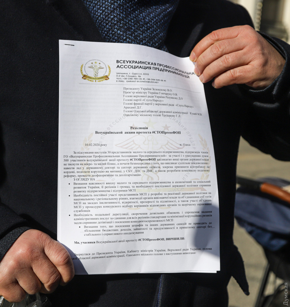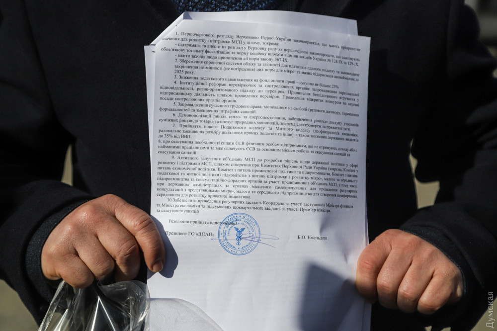 «Это часть всеукраинской акции, — рассказал «Думской» представитель Всеукраинской профессиональной ассоциации предпринимателей Борис Эмельдеш. — Вместе с нами сейчас митингуют предприниматели в 25 городах страны».