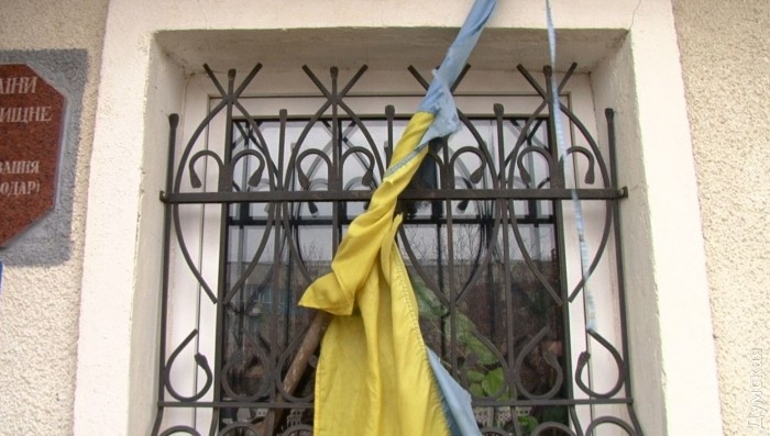 В одноэтажном здании полиции тишина. Заперто. Зарешеченными окнами оно уныло смотрит на людей, словно спрашивая: «Ну, чего приперлись?» Над пунктом вместо флага трепыхаются какие то желто-голубые лохмотья.