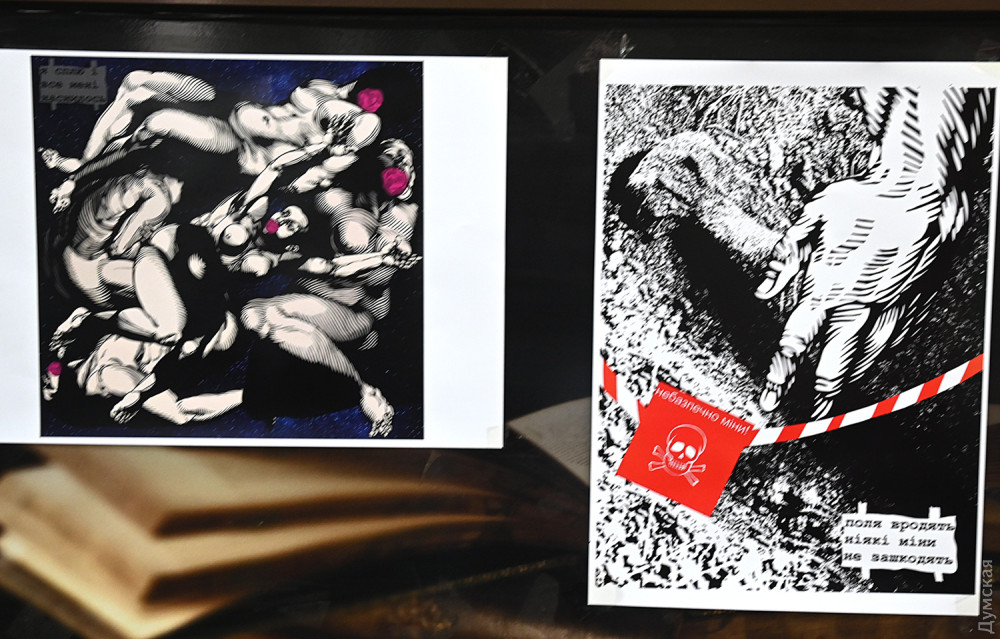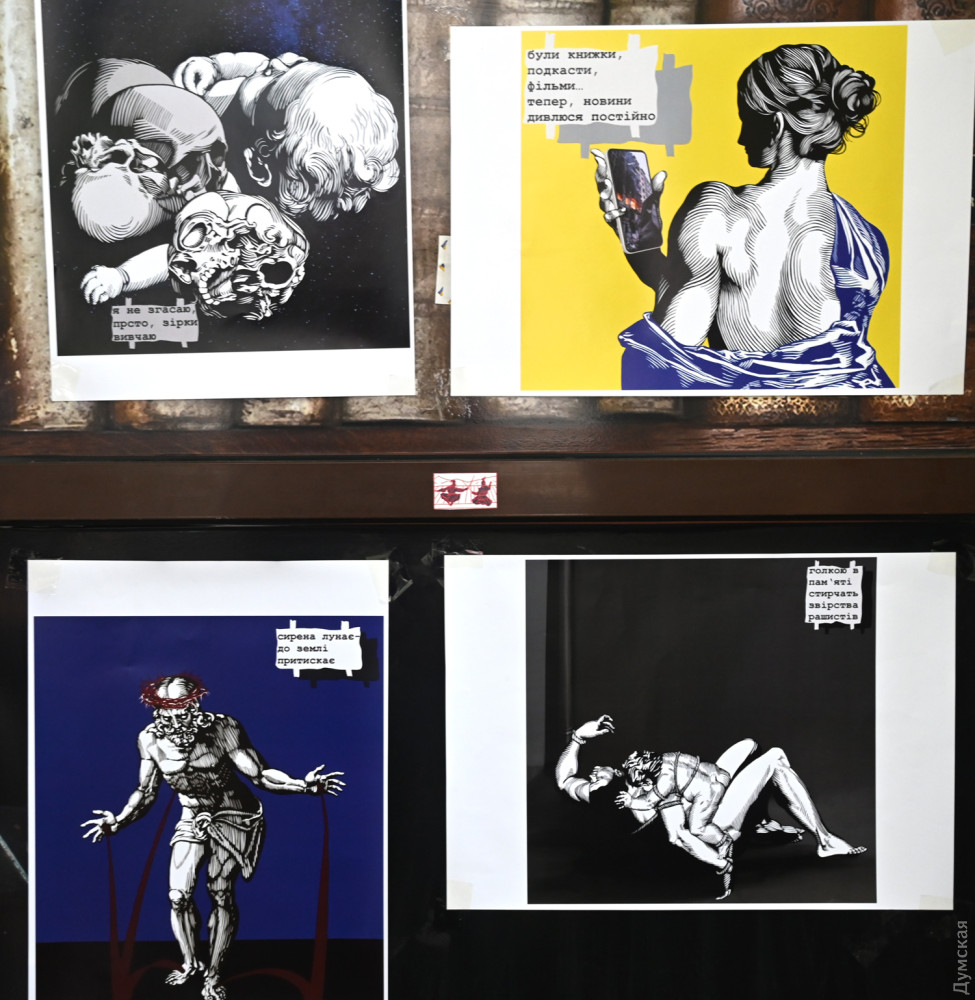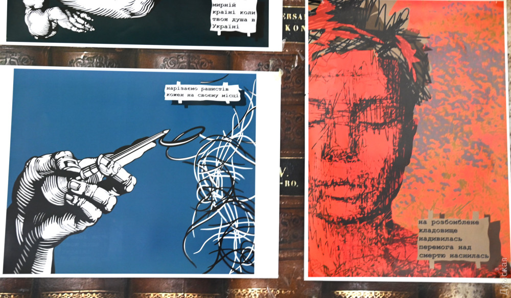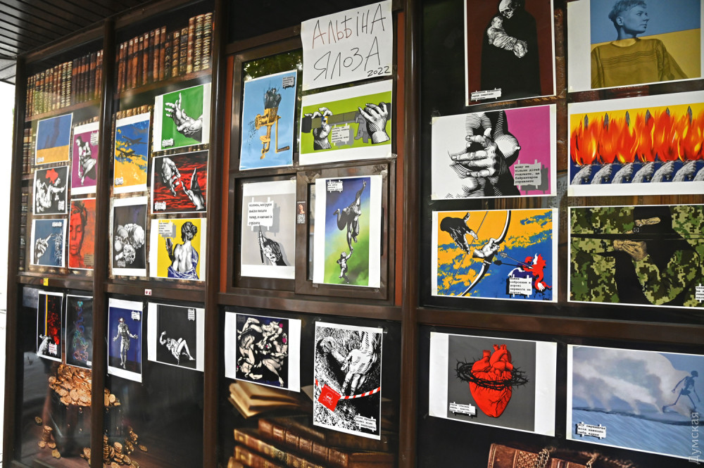 Автор плакатів, що поєднують зображення і заримований текст в дусі народної листівки-лубка — художниця Альбіна Ялоза, добре відома одеському глядачу. Ліричні лінорити мисткині демонструвалися в одеських музеях та галереях. Зараз у Музеї народної архітектури та побуту у Львові імені Климентія Шептицького проходить її масштабний проект «Вівтар небесного воїнства». Фігури янголів немов побували у битві чи то полоні, втрачені фрагменти на це натякають. Це багатолітній мистецький проект, створений у 2015-2016 роках як реакція на війну на сході України. А у нас на «Книжці» зібрані найновіші роботи Альбіни.