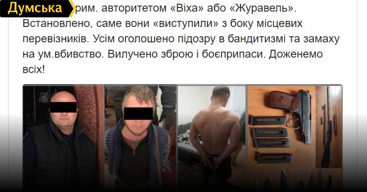 В Киеве, Броварах и Ирпене задержали еще 13 человек, которые принимали участие в перестрелке перевозчиков в Броварах. Об этом сообщил министр МВД Арсен Аваков в своем Твиттере. В числе задержанных — криминальный авторитет «Виха». По данным СМИ, задержанный авторитет — лидер киевской ОПГ Виктор Журавель. Члены банды известны своей жестокостью — их еще прозвали бандой черных коллекторов. Живет в Броварах, а свою деятельность начинал в 90-х в составе одной из ОПГ и больше 10 лет провел в заключении. Некоторое время Журавель был смотрящим за Лукьяновским СИЗО. Напомним, 29 мая в Броварах Киевской области произошел конфликт со стрельбой за междугородние маршрутные перевозки. В результате конфликта пострадали три человека, двое из них с огнестрельными ранениями находятся в больнице. В конфликте приняли участие более 100 человек. Вчера 20 задержанным избрали меру пресечения в виде содержания под стражей. СМЕРТЬ РОСІЙСЬКИМ ОКУПАНТАМ! Помітили помилку? Виділяйте слова з помилкою та натискайте control-enter |