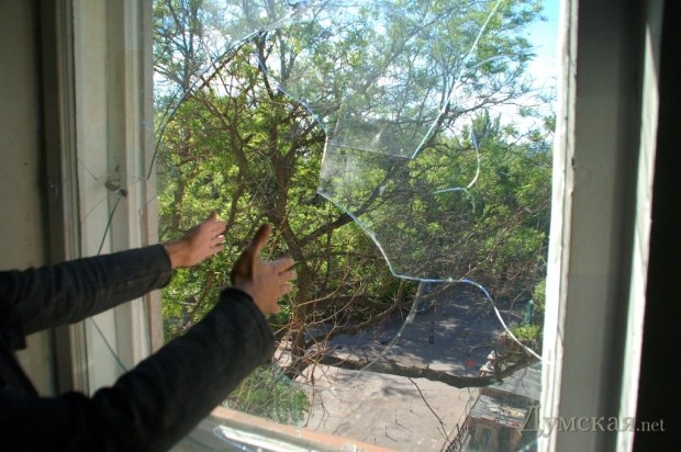 На данный момент мы обнаружили лишь одно неоспоримое доказательство применения огнестрельного оружия — пулевое отверстие в окне лестничного пролета левого (южного) крыла здания. Этот след группа исследовала вместе с журналистами одесских изданий и московской газеты «Комсомольская правда».