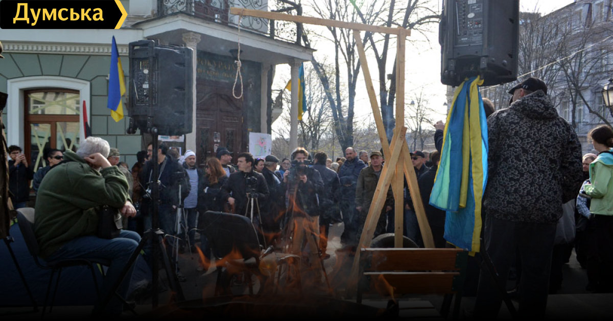 Какая может быть виселица в центре Одессы? Что за пионерский костер там же? Как видно, некоторые лжепатриоты надели тельняшки, типа их мало, но они в тельняшках. Нужно остановить это безумие. Куда смотрит полиция?