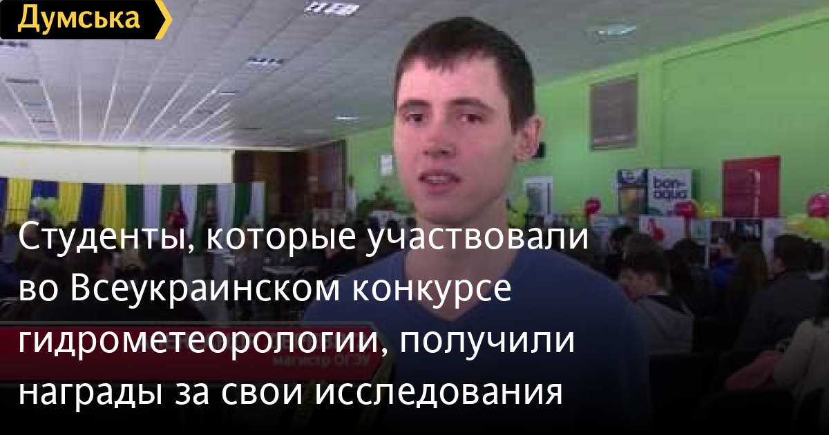 Студенты, которые участвовали во Всеукраинском конкурсе гидрометеорологии, получили награды за свои исследованияМолодые ученые провели важные для страны исследования. Во Всемирный день метеоролога лучшие труды получили награды от комиссии специалистов. По их словам, многие работы уже можно применять на практике СМЕРТЬ РОССИЙСКИМ ОККУПАНТАМ! Заметили ошибку? Выделяйте слова с ошибкой и нажимайте control-enter Думская ТВ. Сюжеты: