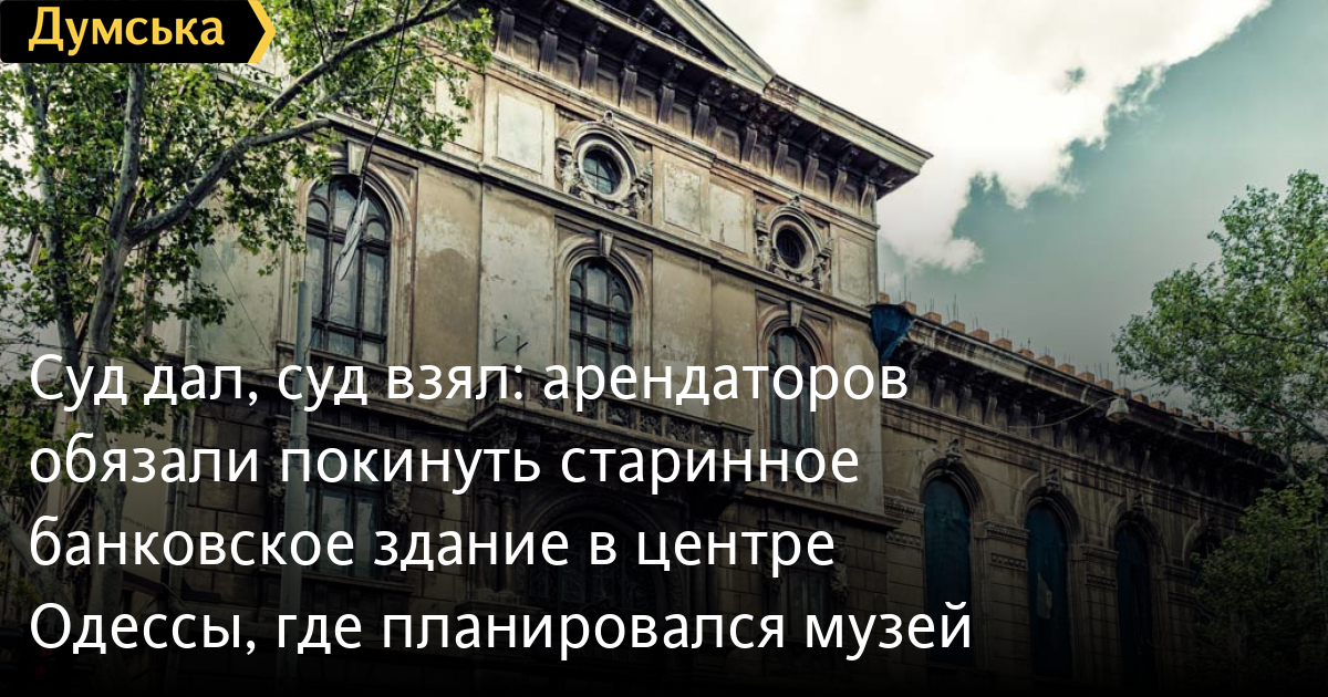 Освободить памятник архитектуры — здание Общества взаимного кредита на Пушкинской, 10 — обязал хозяйственный суд Одесской области его арендатора, компанию «Простір натхнення», руководителем которой был известный художник и скульптор Михаил Рева.