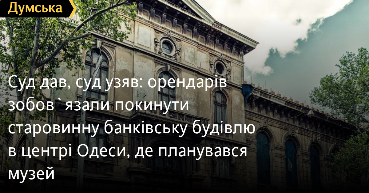 Суд дав, суд узяв: орендарів зобов`язали покинути старовинну банківську будівлю в центрі Одеси, де планувався музейЗвільнити пам'ятку архітектури — будівлю Товариства взаємного кредиту на Пушкінській, 10 - зобов'язав господарський суд Одеської області її орендаря, компанію «Простір натхнення», керівником якої був відомий художник і скульптор Михайло Рева. Як передає кореспондент «Думської», таке рішення суддя Юлія Мостепаненко ухвалила в середині липня, задовольнивши позов обласної прокуратури. Підставою стало порушення орендарем умов договору: він заборгував майже 9 млн грн, не застрахував майно, не уклав охоронний договір і не відреставрував пам'ятку. У підсумку суд розірвав договір оренди і стягнув із «Простору» заборгованість. Відповідач на засідання не з'явився. Раніше він пояснював невиконання договору форс-мажорними обставинами: велика війна тощо. Цікаво, що три роки тому, 2020-го, саме цей суд визнав договір оренди укладеним: його підписання блокувала облдержадміністрація, яка знайшла в документі неприйнятні умови: «Там, зокрема, був момент, що орендар отримає переважне право викупу будівлі вже через три місяці за умови поліпшення цього майна на 20% від цінувальної вартості. При цьому оцінювальна вартість — 9 тисяч грн за квадратний метр. У центрі міста!» — заявляв тоді представник ОДА. «Простір натхнення» звернувся до суду і виграв тяжбу. Будівля Одеського товариства взаємного кредиту була побудована в 1901-1903 році за проєктом Олександра Бернардацці. У 1928 році її перебудували для потреб держбанку СРСР. Будівля сильно постраждала в роки Другої світової, її було відновлено 1948 року. У ній розміщувався міськком ЛКСМУ, а з 1982 року — Будинок політичної освіти обкому Компартії. З 1991 року будівлю орендував банк «Порто-Франко», який збанкрутував у 2014-му. У 2019 році обласна рада оголосила конкурс із вибору орендаря пам'ятки. Згідно з його умовами, переможець повинен буде розмістити в колишньому банку музей і забезпечувати збереження пам'ятки архітектури. У конкурсі взяли участь компанії «Простір натхнення» (за чутками, пов'язана з великим одеським бізнесменом), «Хай-Рейз констракшнз холдинг» (будує висотку в Аркадії), «Житлобудсервіс-1» і «Аркада-Південь», «Інвест-лідер» (афілійована з холдингом Руслана Тарпана). Перемогла перша. Її керівник Михайло Рева заявив, що на пам'ятку чекає реставрація з відновленням фасаду і частини інтер'єрів. «У кожної людини є мрія, — розповідав він тоді. — Для мене — це створення в Одесі міжнародної культурної інституції з якісним контентом, освітніми та виставковими проєктами, а також із насиченою публічною програмою для різних аудиторій. Я мрію, щоб у моєму рідному місті з'явився майданчик світового рівня, що впливає на культурну програму міста і країни. У 2015 році у нас з Олександром Ройтбурдом, Яною Бариновою, Борисом Херсонським, Олексієм Ботвіновим, Арнольдом Кременчуцьким та Ігорем Царенком уже була спроба створення проєкту, що передбачав запуск цілого культурного кварталу міста, що містив легендарну будівлю, зведену 1903 року Олександром Бернардацці. Ми провели низку презентацій і круглих столів для державних структур і потенційних донорів проєкту. Було виконано колосальний обсяг роботи. На жаль, через різні обставини цей задум не реалізувався. Але ми не полишали надію і йшли до мети ці п'