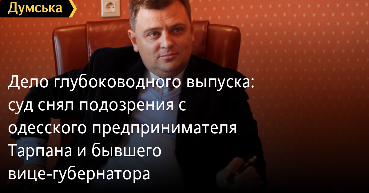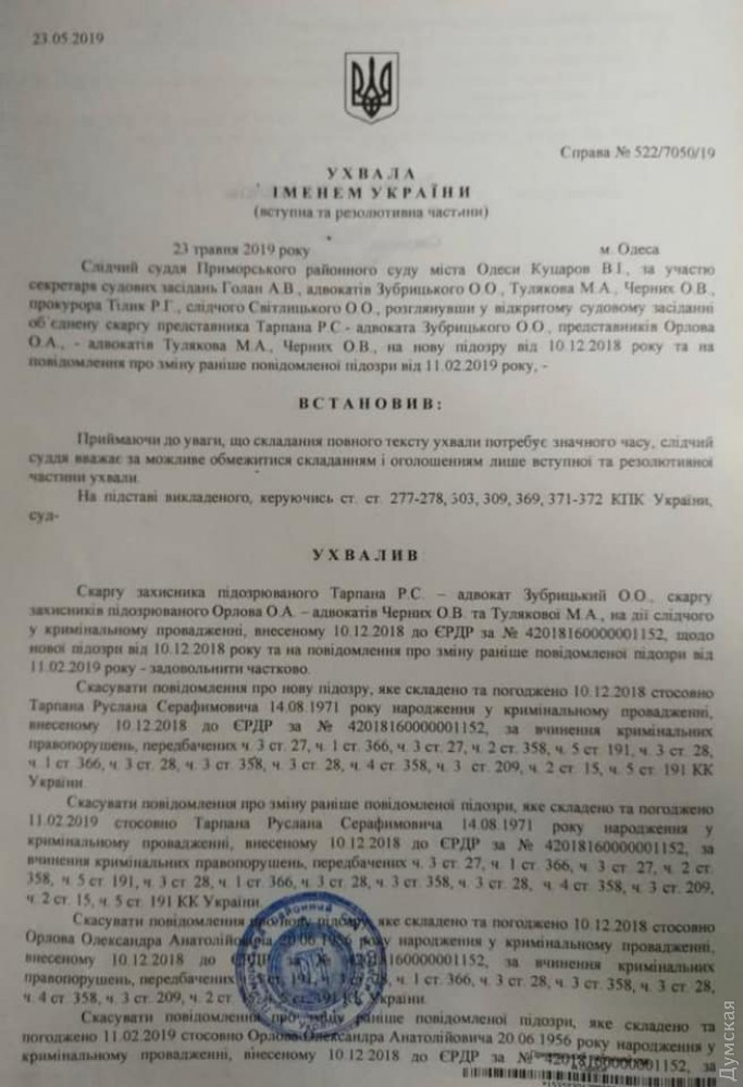 Приморский районный суд Одессы отменил подозрения, объявленные предпринимателю Руслану Тарпану и бывшему вице-губернатору, ныне депутату горсовета от «ОппоБлока» Александру Орлову в рамках уголовного производства о казнокрадстве при строительстве глубоководного выпуска сточных вод.