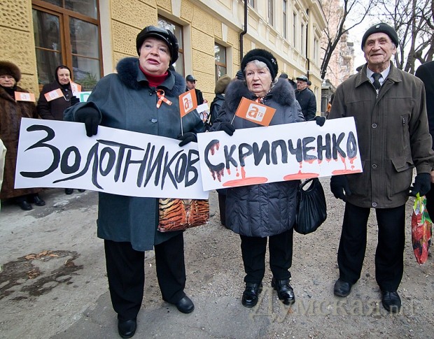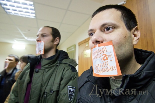 Тем временем под зданием суда на Софиевской собрался небольшой митинг сторонников АТВ. Их было примерно пять десятков. Четверо молодых людей провели пятиминутный флешмоб – они заклеили себе рты наклейками с надписью «Любимый канал».