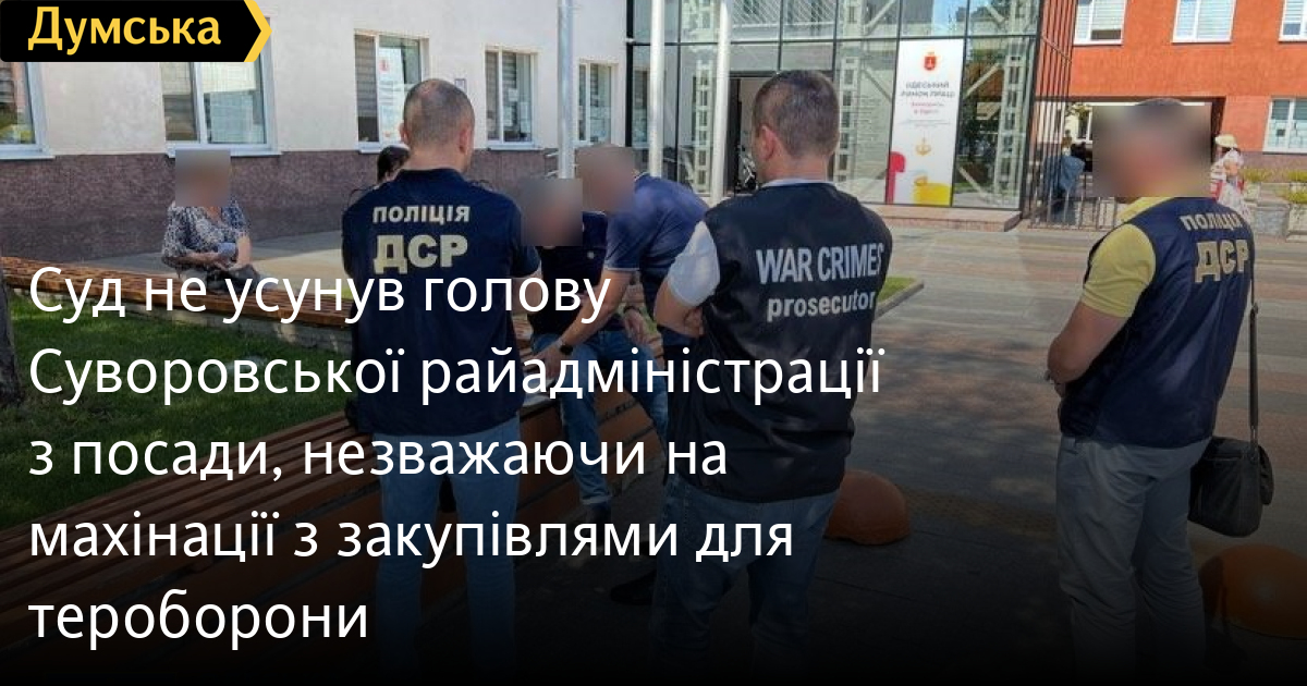 Суд не усунув голову Суворовської райадміністрації з посади, незважаючи на махінації з закупівлями для тероборониСуворівський районний суд Одеси вирішив не усувати з посади керівника Суворовської райадміністрації, якого звинувачують у зловживанні службовим становищем та нанесенні бюджету збитків у розмірі 715 тисяч гривень. Про це стало відомо з ухвали суду. Суддя відхилив клопотання слідчого та прокурора про усунення чиновника з посади, бо вирішив, що він не використовуватиме свого становища для тиску на підлеглих та впливу на перебіг справи. Своє рішення служитель Феміди мотивував також тим, що у підозрюваного на утриманні перебуває 17-річна дитина та хвора сестра. Щоправда, за словами самого голови райадміністрації, крім зарплати, він має додатковий дохід від здачі в оренду приміщень. Зазначимо, що йдеться про Сергія Кондратюка, якому наприкінці серпня повідомили про підозру у зловживанні службовим становищем при закупівлі термобілизни, спальних мішків та карематів для територіальної оборони. На думку слідства, чиновник навмисне переплатив фірмі-постачальнику, чим завдав державному бюджету збитків у розмірі 715 тисяч гривень. Правопорушнику загрожує до шести років позбавлення волі. Помітили помилку? Виділяйте слова з помилкою та натискайте control-enter