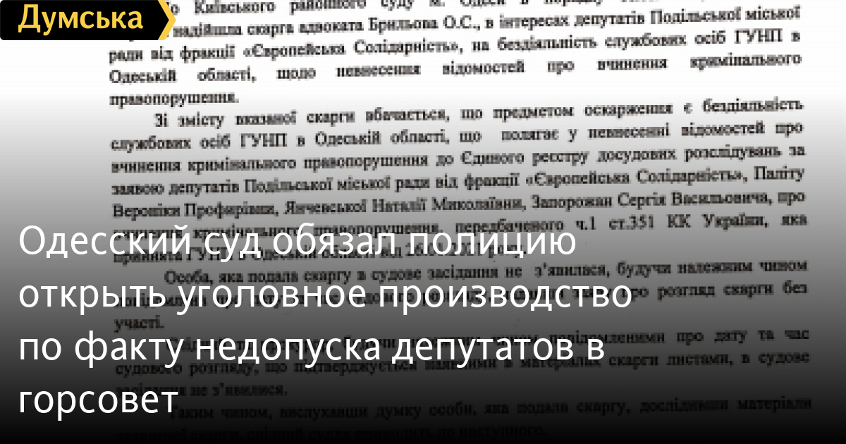 Одесский суд обязал полицию открыть уголовное производство по факту недопуска депутатов в горсоветКиевский районный суд Одессы удовлетворил жалобу адвоката Александра Брилева, который представляет интересы депутатов Подольского горсовета от партии «Европейская Солидарность», и обязал ГУНП в Одесской области открыть уголовное производство по факту недопуска избранников громады в админздание муниципалитета. Такое решение приняла следственный судья Юлия Федулеева. Она согласилась с доводами адвоката о том, что в действиях должностных лиц подольской мэрии присутствуют признаки преступления, предусмотренного частью 1 ст. 351 УК Украины (препятствование деятельности народного депутата Украины или депутата местного совета). Заявление в полицию написали депутаты Вероника Палиту, Наталья Янчевская и Сергей Запорожан. Правоохранители, однако, его проигнорировали — в нарушение положений Уголовного процессуального кодекса Украины. Напомним, инцидент, о котором идет речь, произошел 20 января. Три депутата пришли за документами в орготдел, а также по вопросам предстоящей «тарифной сессии», но охранник горсовета отказался их пропускать, сославшись на карантин. При этом депутаты от других политсил заходили в помещение беспрепятственно. На днях Одесский облсовет поддержал обращение к министру внутренних дел Арсену Авкову по факту недопуска депутатов от ЕС в здание Подольского горсовета. В партии уверены, что распоряжение не пропускать в здание горсовета депутатов от «Европейской Солидарности» связано с тем, что фракция воздержалась от голосования за назначение заработной платы городскому голове Анатолию Иванову в размере 57 тысяч 500 гривен (690 тысяч гривен в год). Согласно декларации о доходах, в прошлом году Иванов в качестве заработной платы получил 561 тысячу 937 гривен. Кроме того, ему выплатили 106 тысяч 787 гривен пенсии. В полиции свое бездействие пока не комментируют. СМЕРТЬ РОССИЙСКИМ ОККУПАНТАМ! Заметили ошибку? Выделяйте слова с ошибкой и нажимайте control-enter |