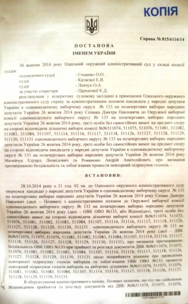 Окружной административный суд Одессы 30 октября отклонил иск кандидата в депутаты Верховной Рады Дмитрия Спивака о пересчете голосов в 133 округе (Киевский район Одессы).