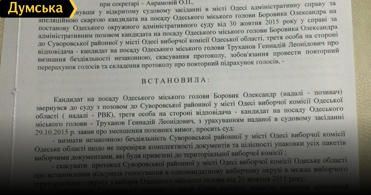 В Одесском апелляционном административном суде отклонили жалобу Саши Боровика относительно решения Одесского окружного административного суда, который не признал выборы в Суворовском районе сфальсифицированными. «Апелляционную жалобу кандидата на должность Одесского городского головы Боровика Александра оставить без удовлетворения, а постановление Одесского окружного административного суда от 30 октября 2015 года оставить без изменений», — говорится в решении судейской коллегии, датированном 3 ноября.