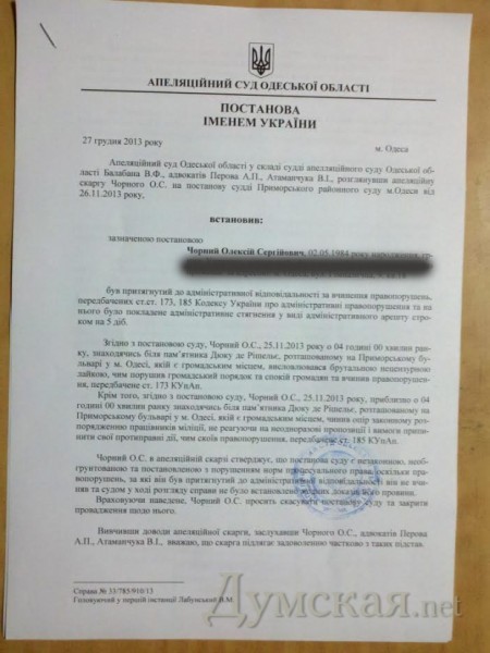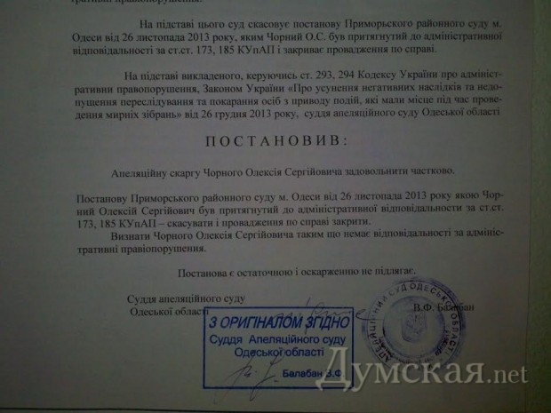 Апелляционный суд Одесской области удовлетворил жалобу участников нашего «Евромайдана» Алексея Черного и Вячеслава Шкрибляка, освободив их от административной ответственности за невыполнение законных требований милиции и хулиганство.
