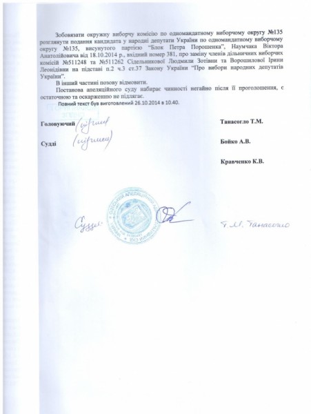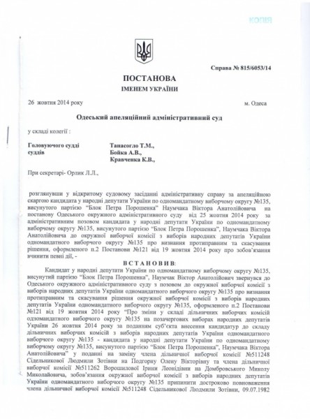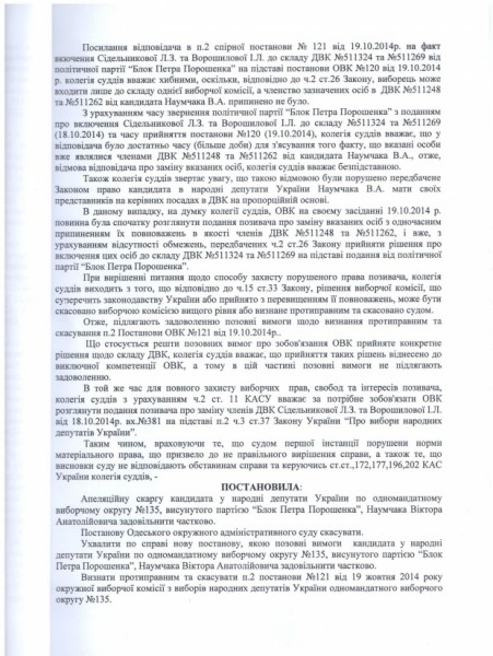 Одесский апелляционный административный суд завершил рассмотрение дела по иску кандидата в народные депутаты Виктора Наумчака к окружкому Приморского района Одессы о незаконном исключении из списков членов комиссий двух представителей, назначенных по квоте политика.