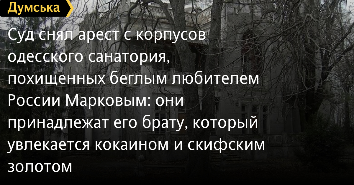 Суд снял арест с корпусов одесского санатория, похищенных беглым любителем России Марковым: они принадлежат его брату, который увлекается кокаином и скифским золотомКоллегия Одесского апелляционного суда удовлетворила жалобы собственников строений бывшего санатория имени Чувырина на Французском бульваре и сняла с последних арест, наложенный первой инстанцией в качестве обеспечения иска прокуратуры, которая добивается возвращения объекта в государственную собственность. Таким образом, граждане Леонид Хворостянный и Олег Марков (брат беглого пророссийского политика Игоря Маркова, сидящий сейчас в российском СИЗО по подозрению в контрабанде исторических ценностей), а также принадлежащие им компании «Івент Менеджмент Груп» и «Бізнес Буд» снова могут пользоваться и распоряжаться зданиями, в том числе их перепродавать и перестраивать. Апелляция посчитала этих лиц добросовестными приобретателями: мол, они не знали о том, что имущество было выведено из госсобственности незаконным путем. Напомним, санаторий им. Чувырина ушел в частные руки в два этапа. Сначала, в 2000-м, «Укрпрофздравница» продала корпуса на приморской стороне Французского бульвара. Продала за более чем смешные деньги – около 500 тыс. грн – фирме «Спарта». Участок под историческими зданиями – 1,5 гектара — был бесплатно оформлен горсоветом на частных лиц. Впоследствии там выросли роскошные особняки, а ближе к морю строится высотка. Второй этап разграбления рекреационного учреждения стартовал в 2005 году. На этот раз объектом притязаний коммерсантов стали здания на противоположной от моря стороне бульвара (2,25 га между Шампанским переулком и академгородком Одесского университета имени Мечникова) — именно с них снял арест апелляционный суд. Руководство санатория заключило с ООО «Авиком» договор купли-продажи строительных материалов на сумму 2 млн 114 тыс. 21 грн. Материалы эти никто в санатории так и не увидел, однако на следующий день они были проданы фирме, которая должна была производить строительные работы. Поскольку якобы переданные санаторию строительные материалы оплачены не были, «Авиком» подал иск в суд. 25 августа 2005 года Хозяйственный суд Киева своим определением утвердил мировое соглашение между сторонами. Согласно ему, в счет погашения долга ООО «Авиком» передали в собственность недвижимое имущество санатория. За фирмой «Авиком» стоял лидер пророссийской партии «Родина» Игорь Марков, ныне скрывающийся от правосудия в РФ. В течение четырех месяцев после захвата в лечебном корпусе здравницы находился офис соратника Маркова, телеведущего Григория Кваснюка. Кроме того, сам Марков неоднократно появлялся на территории санатория. Впоследствии часть зданий получил в собственность его брат Олег, который не только любит старинные драгоценности и кокаин, но неплохо поет — он автор хита «Мелом на белом». Сейчас в украинских судах рассматривается несколько дел, административных, гражданских, хозяйственных и уголовных, связанных с приватизацией санатория Чувырина. СМЕРТЬ РОСІЙСЬКИМ ОКУПАНТАМ! Помітили помилку? Виділяйте слова з помилкою та натискайте control-enter
