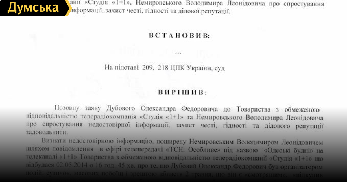 Подольский районный суд Киева вынес решение по иску о защите чести и достоинства, который народный депутат Александр Дубовой подал против экс -губернатора Одесской области Владимира Немировского.