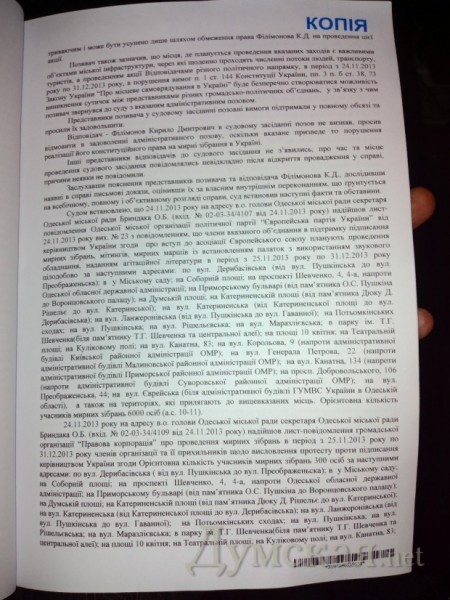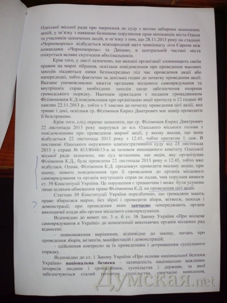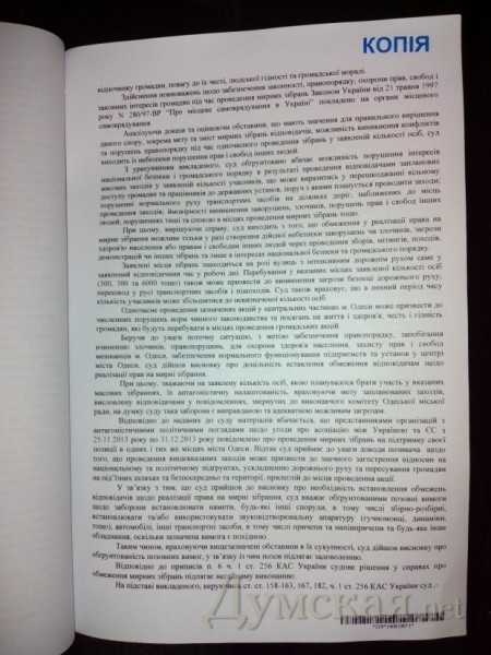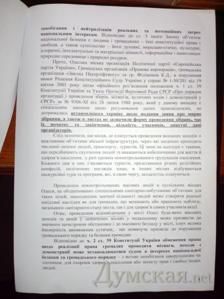 «Таким образом, на сегодняшний день не существует судебного решения, которое бы запрещало кому-либо проведение любых массовых акций, за исключением лиц и акций, перечисленных в принятых решениях, и их участников, — отметил Михаил Шмушкович. — Одесситы могут абсолютно законно проводить митинги и демонстрации. Для этого необходимо заблаговременно уведомить об этом органы местного самоуправления или органы государственной власти».