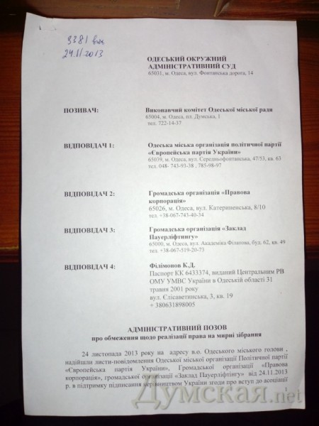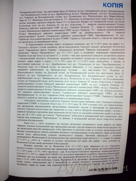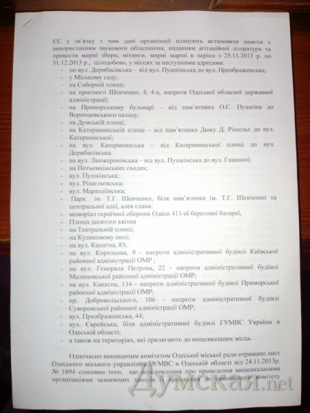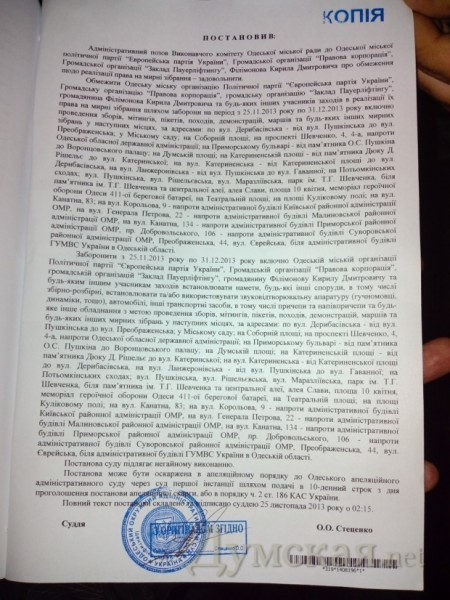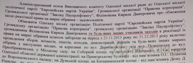 Однако судья Олег Стеценко, удовлетворяя исковое заявление, изменил предложенную формулировку и указал, что запрет касается ответчиков «и любых других участников мероприятий». При этом и в тексте иска, и в письме городского управления милиции, и в судебном решении абсолютно однозначно речь идет о конкретных четырех мероприятиях, по которым были поданы заявки.