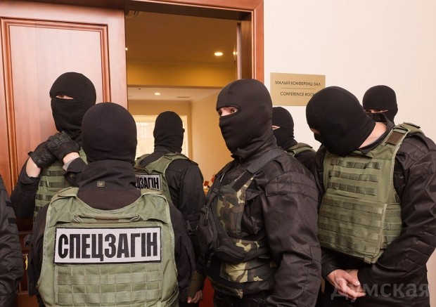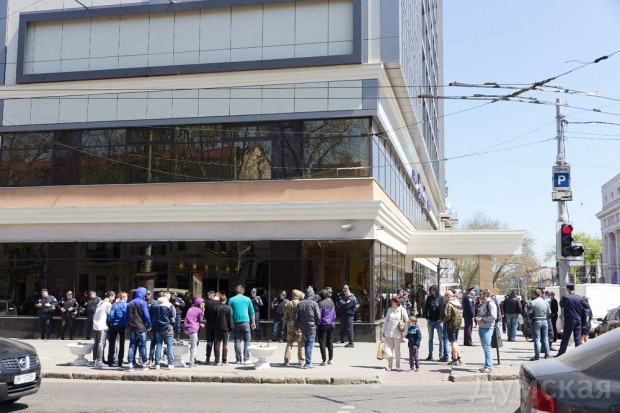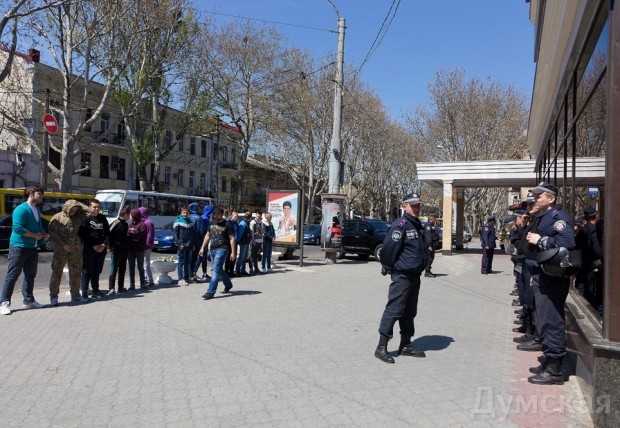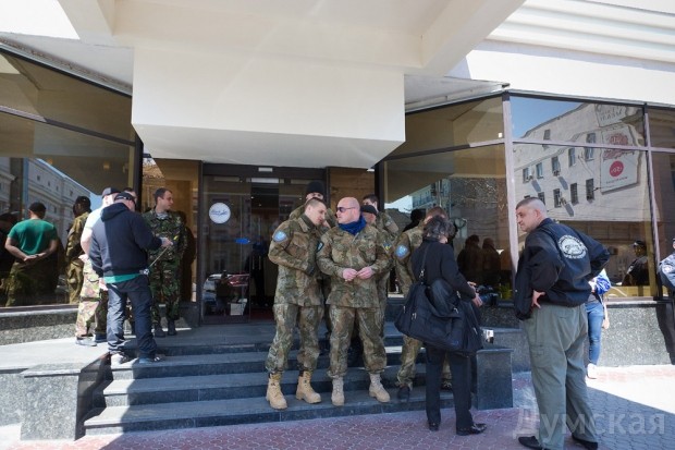 Вход в гостиницу «Черное море», что на Ришельевской улице заблокирован активистами патриотических организаций, а само здание окружено милиционерами.
