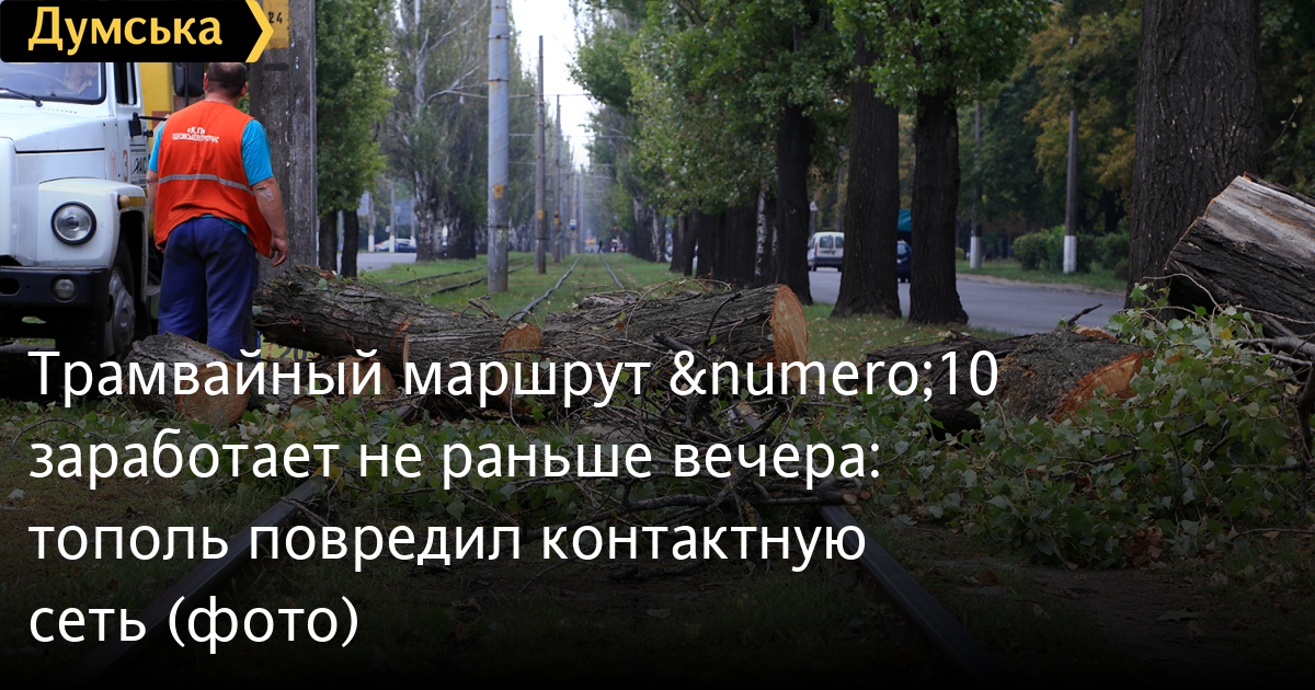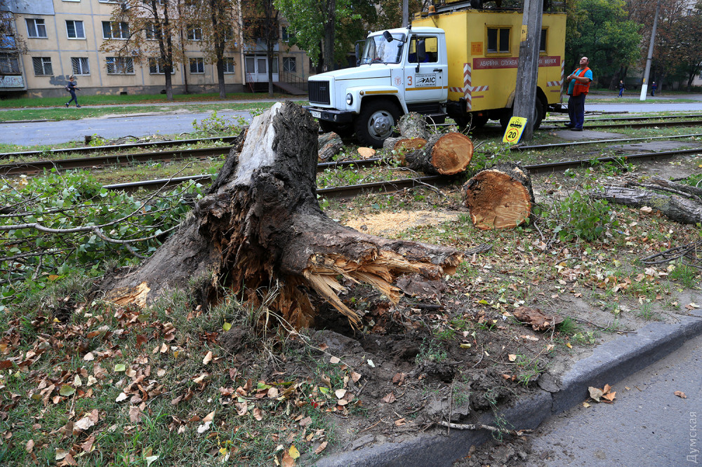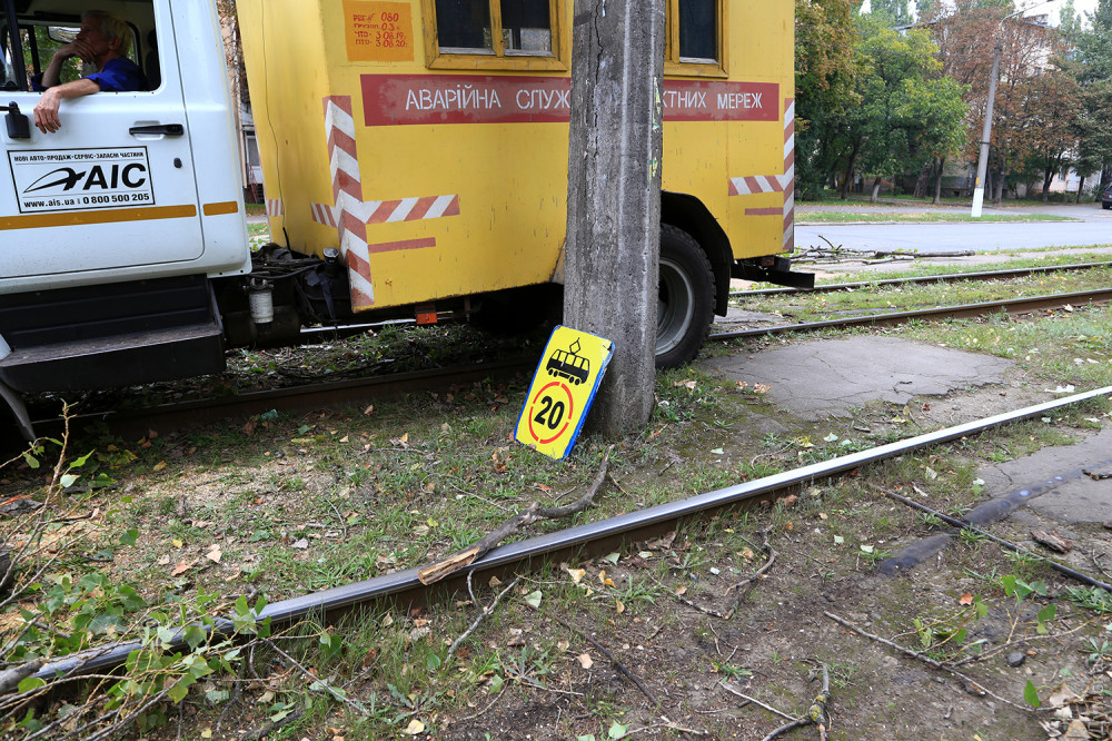 Упавший между остановками «ул. Генерала Петрова» и «ул. Героев Крут» тополь согнул пятиметровый металлический кронштейн, который держит контактную сеть.
