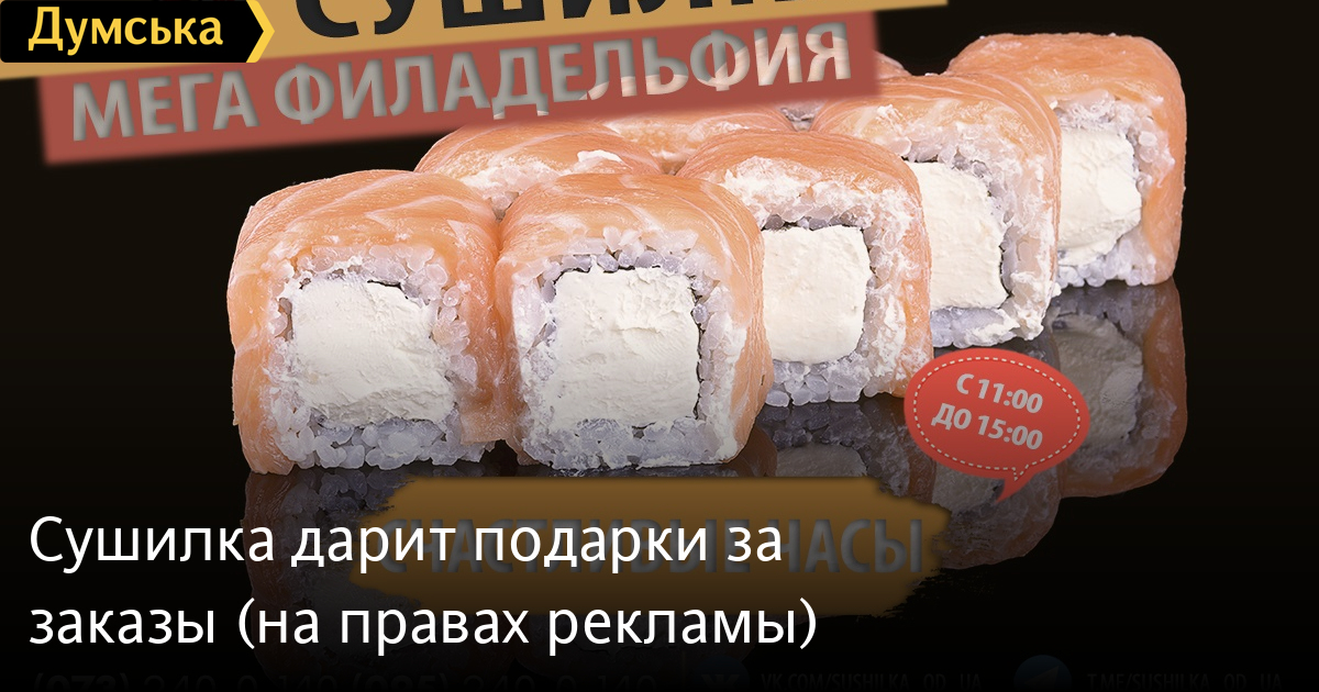Сервис доставки еды «Сушилка» продолжает радовать своих клиентов. С 30 апреля при совершении заказа на сумму более 350 гривен, вы получите в подарок банку (0,25л) Coca Cola.