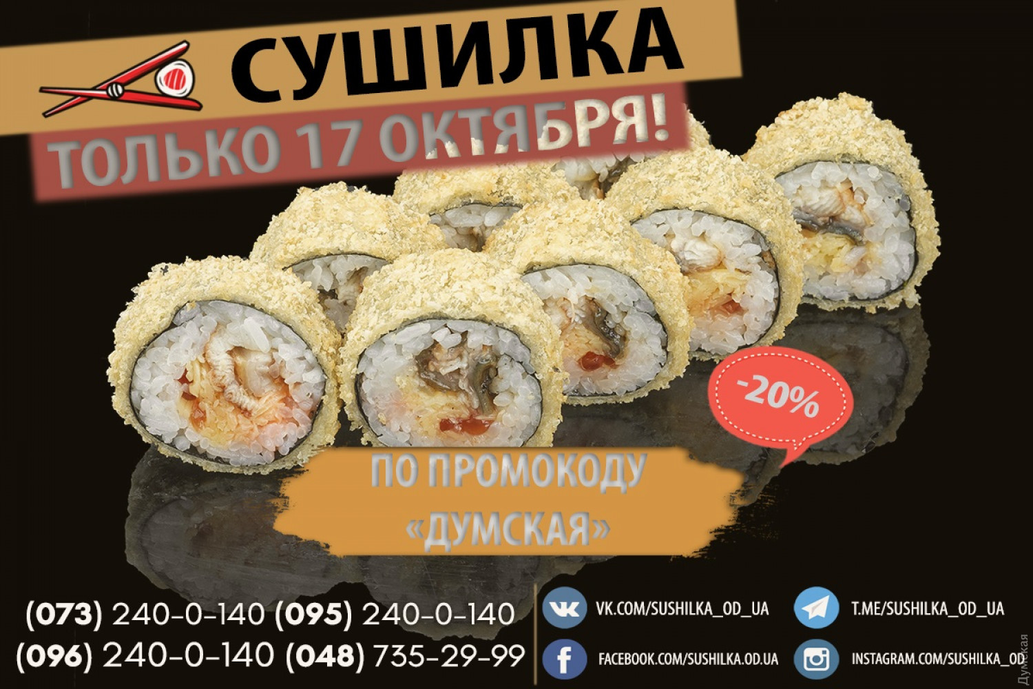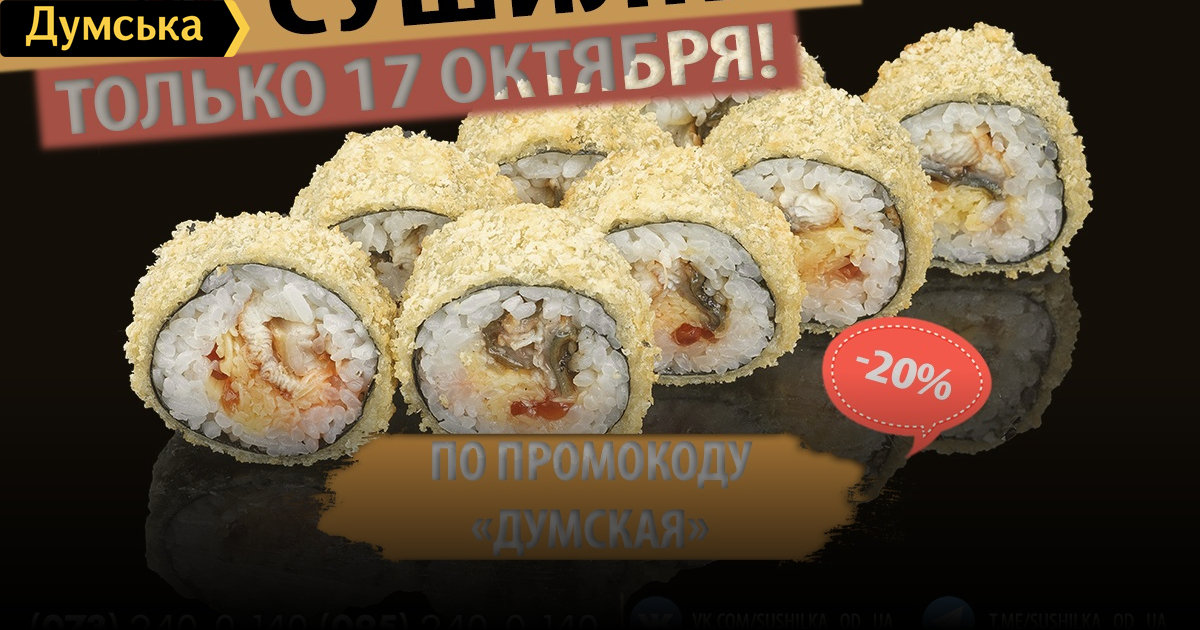 “Сушилка” дарит промокод на скидку и отдает каждую третью пиццу бесплатно (на правах рекламы)Сервис доставки еды «Сушилка» напоминает, что сегодня проходит регулярная акция «Crazy вторник», в рамках которой при заказе двух пицц, третью вы получаете совершенно бесплатно! Акция распространяется на пиццы всех доступных размеров, а скидка будет применяться на пиццу с меньшей стоимостью. Кроме того, 17 октября сервис подарит 20% скидку всем, кто при заказе назовет оператору промокод «Думская». Скидка не распространяется на товары из категорий «Сеты» и «Напитки». При этом уже совсем скоро клиентов сервиса ожидают горячие осенние новинки! Заказ можно сделать на сайте sushilka.od.ua или по телефонам: 073-240-0-140; 095-240-0-140; 096-240-0-140; 048-735-29-99. СМЕРТЬ РОСІЙСЬКИМ ОКУПАНТАМ! Помітили помилку? Виділяйте слова з помилкою та натискайте control-enter |