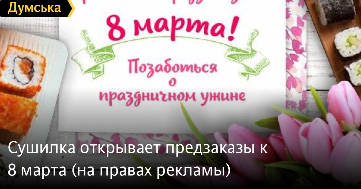 «Сушилка» открыла предзаказы к Международному женскому дню. Минимальная сумма заказа в этот день составит 500 гривен. «Также на сет «Весенний» продолжает действовать скидка, благодаря чему его цена снизилась до 399 гривен!» — рассказали в службе доставки. Узнать подробнее об акциях и сделать заказ можно на сайте sushilka.od.ua и по телефонам: 073-240-0-140; 095-240-0-140; 096-240-0-140; 048-735-29-99. СМЕРТЬ РОССИЙСКИМ ОККУПАНТАМ! Заметили ошибку? Выделяйте слова с ошибкой и нажимайте control-enter |