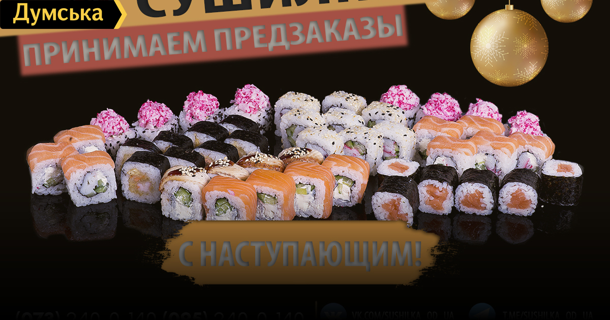 «Сушилка» поздравляет с наступающим Новым годом и открывает предзаказы на 31 декабря (на правах рекламы)Доставка суши «Сушилка» поздравляет всех одесситов с наступающим Новым годом и сообщает, что уже открыта возможность совершить предварительный заказ на 31 декабря, поскольку в этот день сервис будет работать лишь до 20:00. Кроме того, 1 января 2018 года «Сушилка» будет принимать заказы с 14:00 до 23:00, а со 2 января сервис вернется в привычный график работы — наши операторы будут ждать ваших заказов с 11:00 до 23:00. На сайте можно ознакомиться подробно с ассортиментом и особенностями доставки. Заказ и предзаказ можно сделать, как на сайте sushilka.od.ua, так и, позвонив по телефонам: 073-240-0-140 (Lifecell); 095-240-0-140 (Vodafone); 096-240-0-140 (Kyivstar); 048-735-29-99 (городской). СМЕРТЬ РОСІЙСЬКИМ ОКУПАНТАМ! Помітили помилку? Виділяйте слова з помилкою та натискайте control-enter |