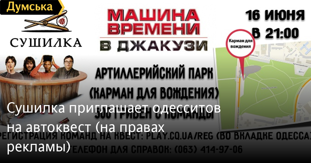 Служба доставки еды «Сушилка» приглашает горожан принять участие в легендарном нашумевшем автоквесте от «Сити квест» по мотивам комедии «Машина времени в джакузи». Игра пройдет 16 июня. Старт намечен на 21:00 в Артиллерийском парке со стороны Люстдорфской дороги. Сбор участников в 20:30. Призеров квеста ждут разнообразные вкусные подарки от «Сушилки», а также бесплатное посещение квест-комнаты. «Сити Квест – командная развлекательная игра в реальном мире, во время которой ваша команда будет решать загадки, перемещаться по городу и выполнять разные задания», — рассказывают организаторы. Стоимость участия — 500 гривен с команды. Организаторы подчеркивают, что с собой необходимо иметь: автомобиль, телефон с интернетом, письменные принадлежности, фонарики, карту города, фотоаппарат, логику и хорошее настроение. Зарегистрироваться и подать заявку можно тут: play.cq.ua/3232. Все, кто придет в кимоно или с бензопилой, получат приятный бонус. СМЕРТЬ РОСІЙСЬКИМ ОКУПАНТАМ! Помітили помилку? Виділяйте слова з помилкою та натискайте control-enter |