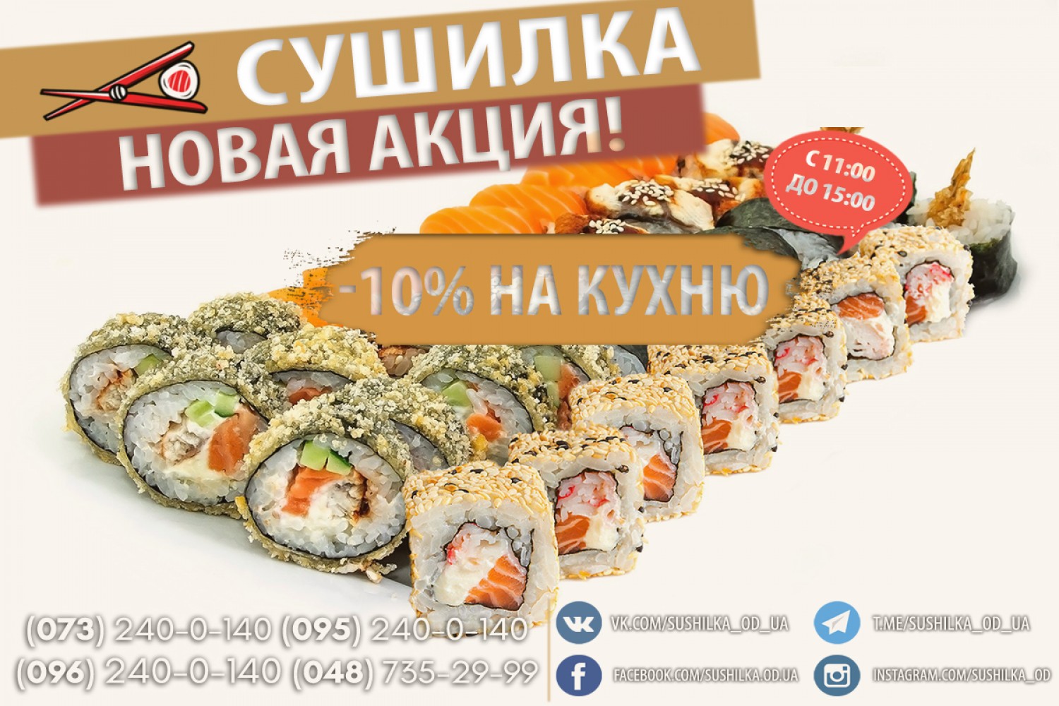 Служба доставки суши «Сушилка» от «Одесса как она есть» запустила новую акцию. Так, если клиент совершает заказ в период с 11:00 до 15:00, то получает скидку 10% на кухню (то есть скидка распространяется на всю продукцию за исключением напитков). Кроме того, в скором времени «Сушилка» планирует расширить меню, добавив в него пиццу и вок. Следите за новостями! «Также напоминаем, что продолжает действовать акция «Ролл за фотоотзыв». Вам необходимо всего лишь сделать фото вашего заказа вместе с чеком, указать номер карты «Сушилки» и номер заказа, а после опубликовать в нашей группе в социальной сети Вконтакте, Facebook или Instagram. После этого вы получите ролл бесплатно при следующем заказе», — отметили в службе. Не забыла «Сушилка» и про именинников. В день рождения при предъявлении паспорта можно получить скидку 20% в подарок. Подробнее об ассортименте и правилах доставки — на сайте sushilka.od.ua. Совершить заказ можно по телефонам: 073-240-0-140; 095-240-0-140; 096-240-0-140; 048-735-29-99. СМЕРТЬ РОСІЙСЬКИМ ОКУПАНТАМ! Помітили помилку? Виділяйте слова з помилкою та натискайте control-enter |