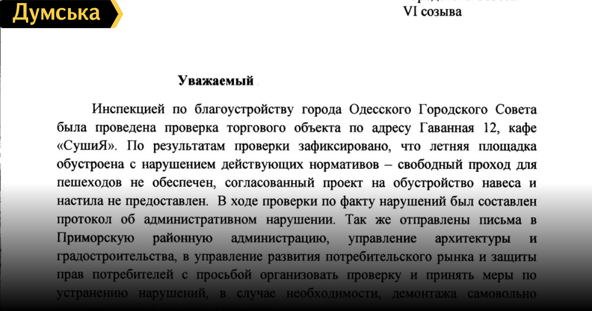 Вызвавшая широкий резонанс публикация «Думской» о расположенном в самом центре Одессы ресторане «СушиЯ», администрация которого, в нарушении всех норм, оборудовала свою летнюю площадку прямо на тротуаре ул.Гаванной, полностью перекрыв доступ пешеходам, получила реакцию и со стороны чиновников. Один из депутатов Одесского городского совета, прочитав нашу публикацию, обратился в соответствующие органы, и получил официальный ответ, копией которого располагает наше издание.