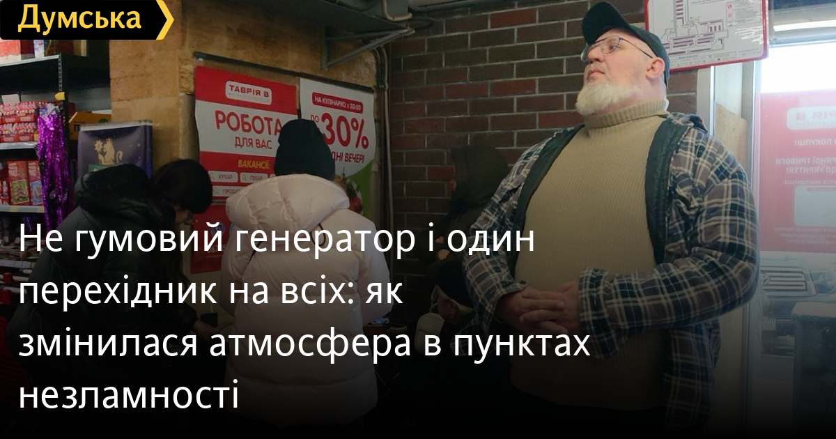 «Не гумовий» генератор і один перехідник на всіх: як змінилася атмосфера в пунктах незламностіРанок одеситів почався з пошуків пунктів незламності. Наш постійний автор Дмитро Жогов вирушив до супермаркету. Ще два роки тому в цьому місці панували взаємодопомога і людяність, а тепер тут — випробування на витримку і здатність залишатися людьми, коли навколо темно, холодно і всім однаково погано. Це історія про один перехідник, «гумовий» генератор і чергу зі скандалами. У мене, як на гріх, все розрядилося: і ноутбук, і телефон, і пауербанк. На останньому подиху написав у редакцію: «Пішов у пункт незламності заряджатися. Все розряд » І все. Пункт у мене під вікном у супермаркеті. Два роки тому там була своя атмосфера. Особлива. Тоді одесити швидко прийшли до тями після блекаутів. Приходили в магазин, заряджали гаджети. Брали маленькі червоні пластикові табуретки, на які продавчині ставали, щоб дістати до верхніх полиць, — і сідали на них у овочевому відділі. Пліткували. Сперечалися. Звідти відкривався гарний вид на лікеро-горілчаний відділ, і у бабусь був повний карт-бланш. Пару разів чоловіки, які заскочили за шкаліком, побачивши цей ряд сторожових горгулій, розверталися і робили байдужий вигляд — ніби вибирають мандаринки. Тоді було відчуття і злих веселощів, і єднання. Відчуття взаємодопомоги. У кожному відділі лежали подовжувачі. Іноді траплявся упир, який забороняв користуватися принесеним перехідником на чотири розетки, хоча сам займав тільки одну. І через два роки все змінилося Пункт незламності перенесли до входу. Між камерами схову і непрацюючою касою. Біля нього переминалося з ноги на ногу кілька бабусь. І всього один подовжувач на чотири розетки — і все. У супермаркеті порожньо. Ми підключили до вільного гнізда перехідник, який принесли з дому, і зарядили свої гаджети. Тут же продавчиня, що проходила повз, буркнула, що їхній генератор «не гумовий». Я трохи очманів. Бабусі підходили, а місць для підключення не було. Я звернувся до продавчині — вона тільки махнула рукою: для цього потрібен електрик. Нічого не знаю. У цей момент в супермаркет увірвалася тітка, схожа на мопса, що відкинувся з зони: — Чого стала тут, дурепа?! — закричала вона на бабусю біля входу. Та охнула і відступила. — Кошик заважає взяти, стерва! — проричав «мопс» і поскакав углиб маркету. Бабуся в окулярах безсило сіла на єдиний стільчик: — Який народ нині пішов Озлоблений. Я пішов шукати адміністратора. Постукав у кімнатку з табличкою «Стороннім вхід заборонено». Звідти на мене подивилася дівчина. Я ввічливо представився журналістом «Думської» і запитав, хто може допомогти розгорнути пункт незламності. А то виходить не «незламність», а нісенітниця. Дівчина закипіла. Видно, накопичилося. Щось вирувало всередині і чекало виходу. — Директор там, на вулиці, товар приймає. — А ви не могли б мені його показати? Я просто його в обличчя не знаю. Тут дівчинку і прорвало: — Показати? Як мене все дістало, звільнюся! Звільнюся звідси. Вона швидко вийшла на вулицю. І повернулася: — Його там немає. Я вибачився і повернувся до групи бабусь. — Сказали, директора немає. І лаялися сильно. — Ох-хо-хох За що ж лаятися? — перелякалися бабусі. Прийшла жінка, побачила, що підключитися нікуди, і пішла купити трійник. Підійшла бабуся з повною сумкою порожніх баночок — робить свічки для З
