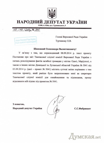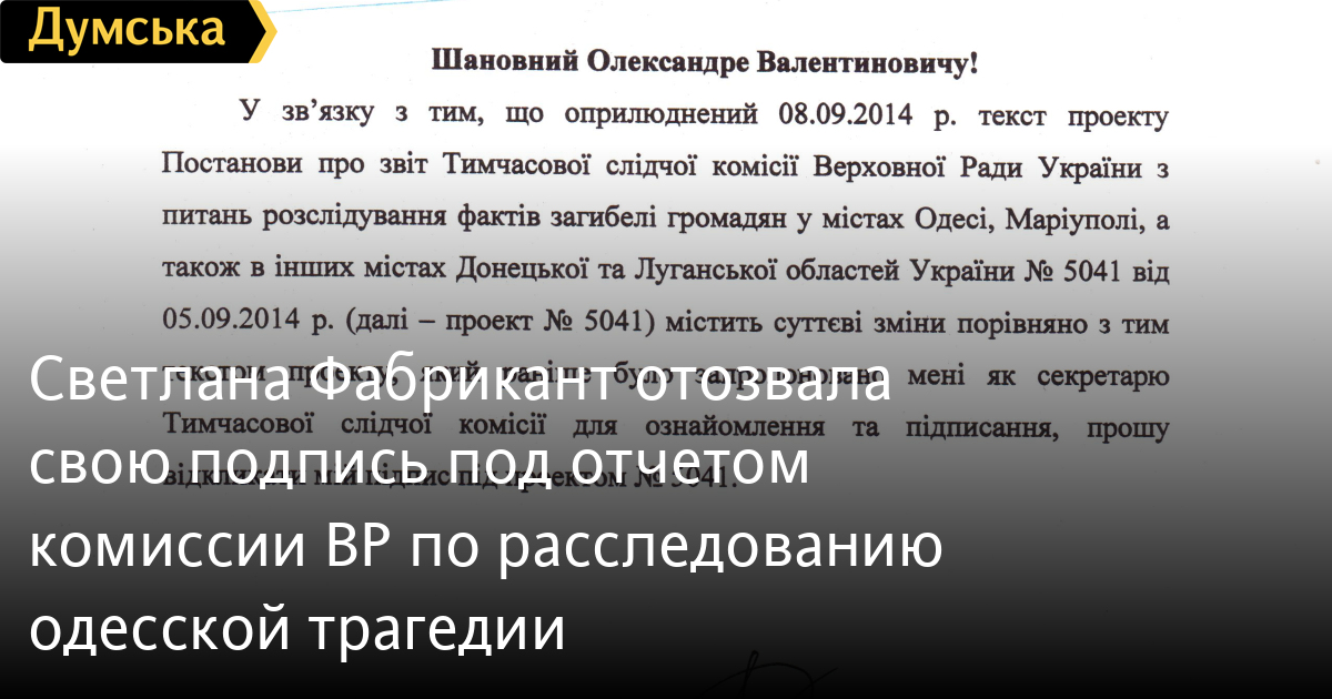 Народный депутат Украины Светлана Фабрикант отозвала свою подпись под отчетом парламентской комиссии по расследованию обстоятельств одесской трагедии. Политик сделала это после публикации «Думской», которая установила, что уже после подписания документа некоторыми нардепами в его текст были внесены правки, которые частично искажают суть документа. «К сожалению, после того, как я поставила свою подпись под текстом, в него вносились правки других членов следственной комиссии, — отмечается в официальном заявлении Светланы Фабрикант. – После обнародования отчета на сайте ВР выяснилось, что моя подпись стоит под другим, по сути, документом, согласиться с которым я не могу».