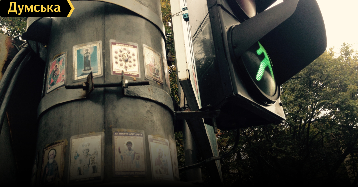 Светофор на углу улиц Академика Филатова и Космонавтов следует, наверное, признать самым безопасным, ведь за его работой следит и Богородица, и святой Николай, и еще с десяток разных угодников.