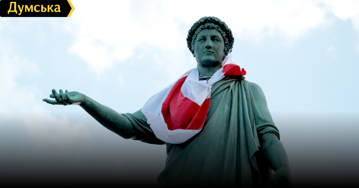 Участники акции повязали на статую Дюка де Ришелье бело-красно-белый флаг свободной Беларуси — как символ свободы протестующего народа, который сейчас избивают силовики Лукашенко.
