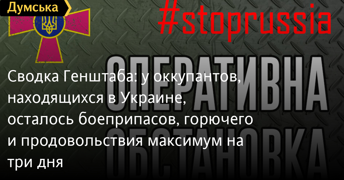 У противника остаются существенные проблемы с обеспечением своих войск. По имеющейся информации, российские оккупационные войска, действующие на территории Украины, имеют запасы боеприпасов и продовольствия не более чем на три дня. Аналогичная ситуация с горючим.