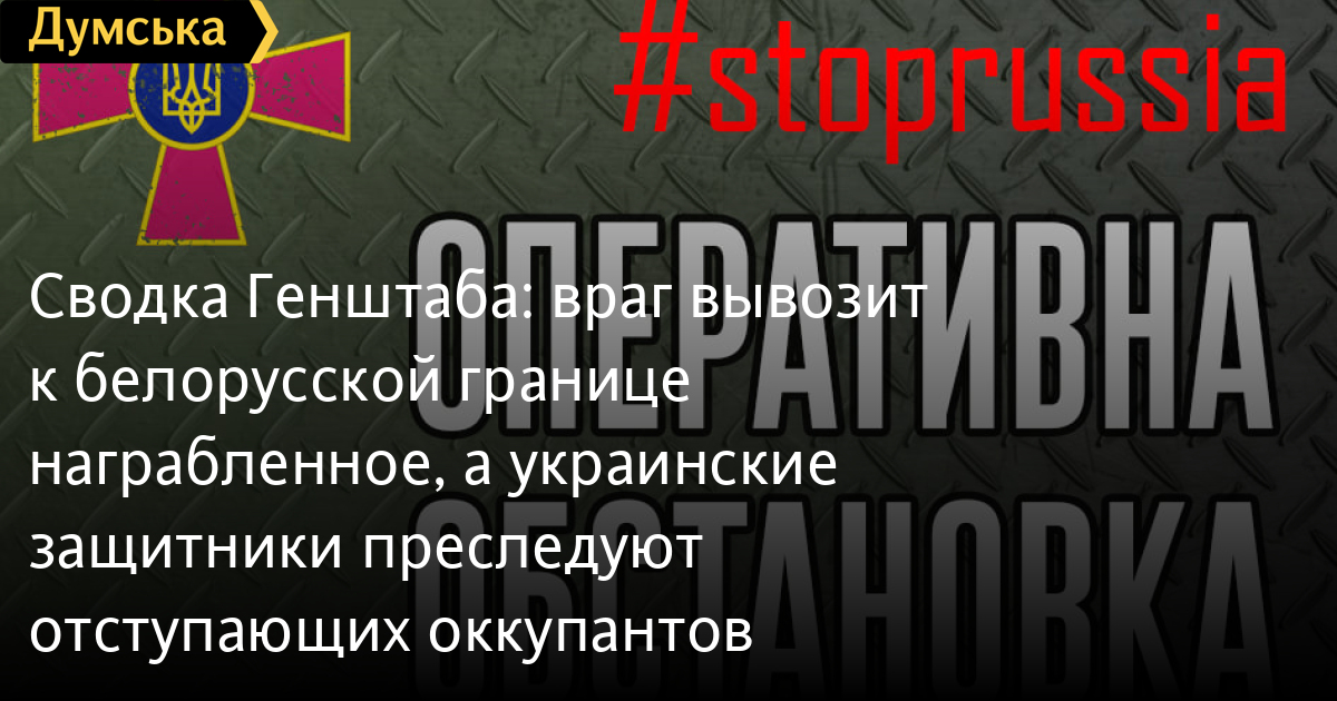 Как говорится в утренней сводке Генштаба, наблюдается продолжение частичного отвода подразделений российских оккупационных войск с севера Киевской области в сторону государственной границы с Беларусью. Фиксируется движение смешанных колонн техники разного количества. В составе колонн также гражданские транспортные средства (грузовики, автобусы, микроавтобусы, легковые автомобили), которые были угнаны российскими захватчиками во время временного занятия территорий. Кроме того, противник вывозит награбленное имущество.