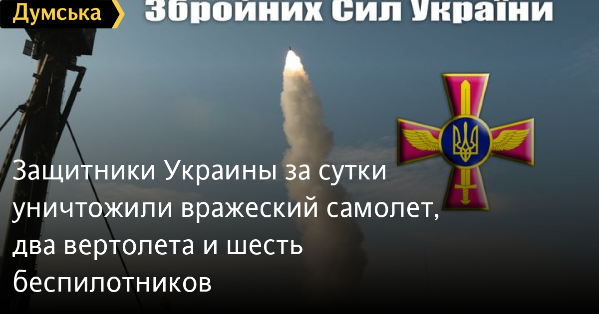 Защитники Украины за сутки уничтожили вражеский самолет, два вертолета и шесть беспилотниковПротивовоздушная оборона Воздушных сил и Сухопутных войск за минувшие сутки уничтожили один самолет, два вертолета, шесть беспилотников и несколько крылатых ракет врага. Об этом говорится в сводке Командования Воздушных сил ВСУ. «Авиацией Воздушных сил проведено десятки вылетов с воздушными боями, перехватами и ударами по колоннам и скоплению техники оккупантов», — говорится в сообщении. СМЕРТЬ РОССИЙСКИМ ОККУПАНТАМ! Заметили ошибку? Выделяйте слова с ошибкой и нажимайте control-enter |