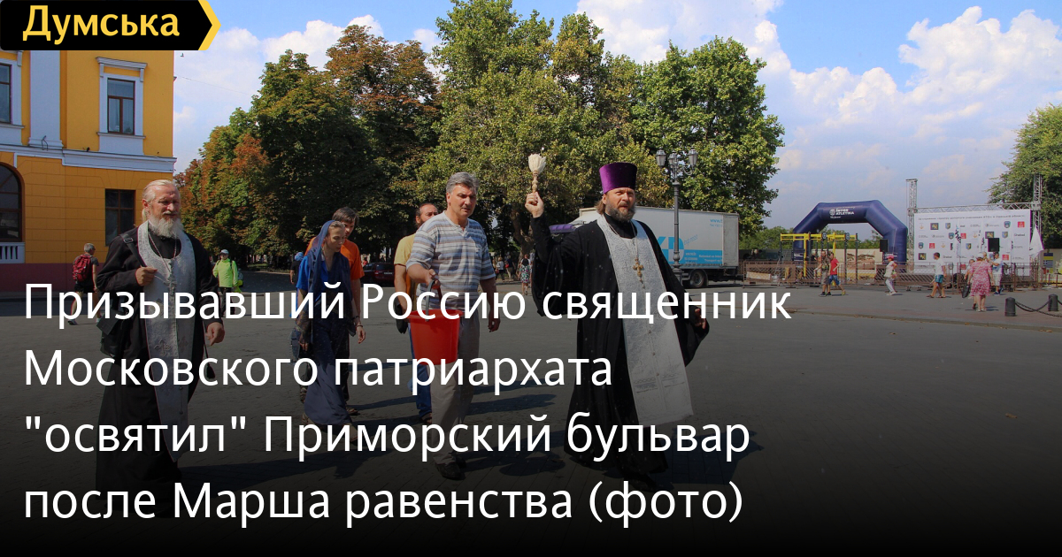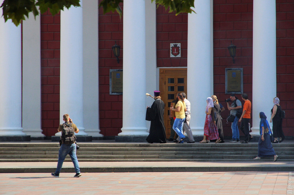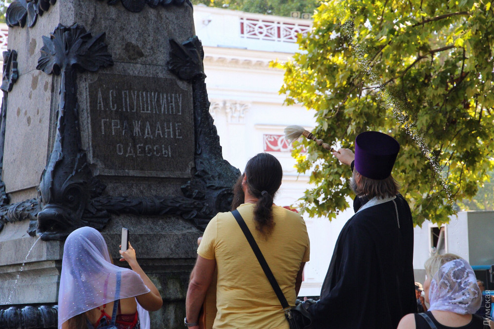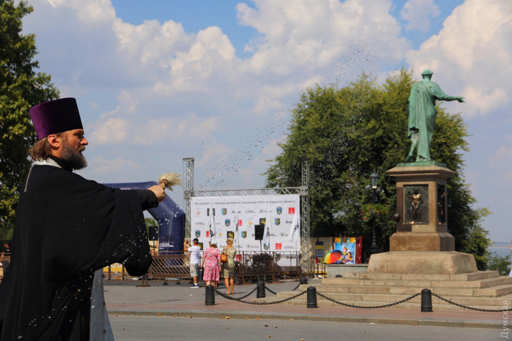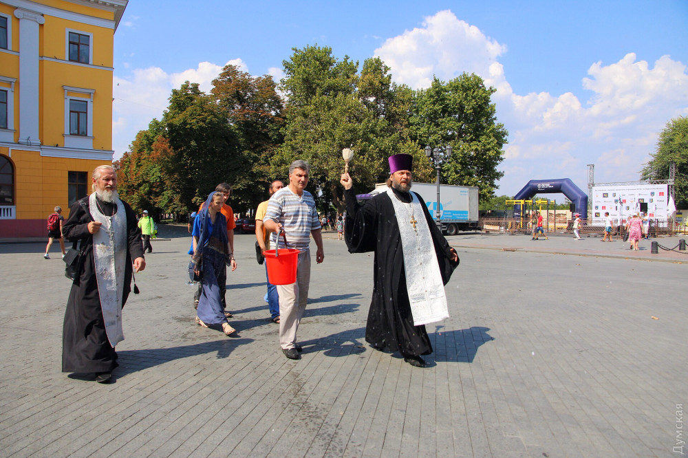 Вооружившись кропилом, Олег Мокряк, которого сопровождали сочувствующие с иконой Богоматери, обрызгал водой памятники Дюку и Пушкину, а также здание мэрии. Он пообещал молиться, чтобы «Господь Бог защитил Одессу и Украину от пропаганды гомосексуализма».