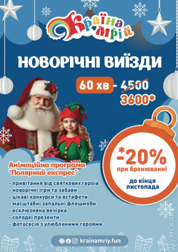 Країна Мрій чекає маленьких одеситів, аби подарувати справжнє новорічне диво (на правах реклами)Свята наближаються! Хочете подарувати своїй малечі справжнє новорічне диво? Країна Мрій пропонує чарівні новорічні привітання, які створять атмосферу свята будь-де! На вас чекають: привітання від Санти або ж Миколая та їхніх помічників, цікаві конкурси та веселі естафети, солодкі призи для кожного, фото з улюбленими героями, масштабні запальні флешмоби та ексклюзивна новорічна вечірка. І гори щирих вражень та емоцій! Подаруйте дітям незабутнє свято у найчарівніший час року! Бронюйте новорічну програму вже зараз — до кінця листопада діє святкова знижка! +380 50 331 77 15 СМЕРТЬ РОСІЙСЬКИМ ОКУПАНТАМ! Помітили помилку? Виділяйте слова з помилкою та натискайте control-enter |